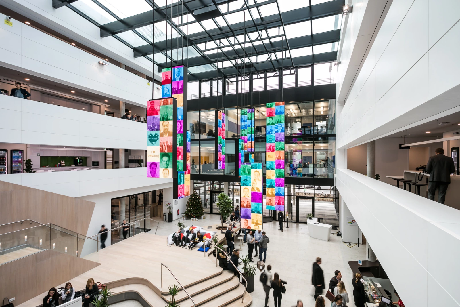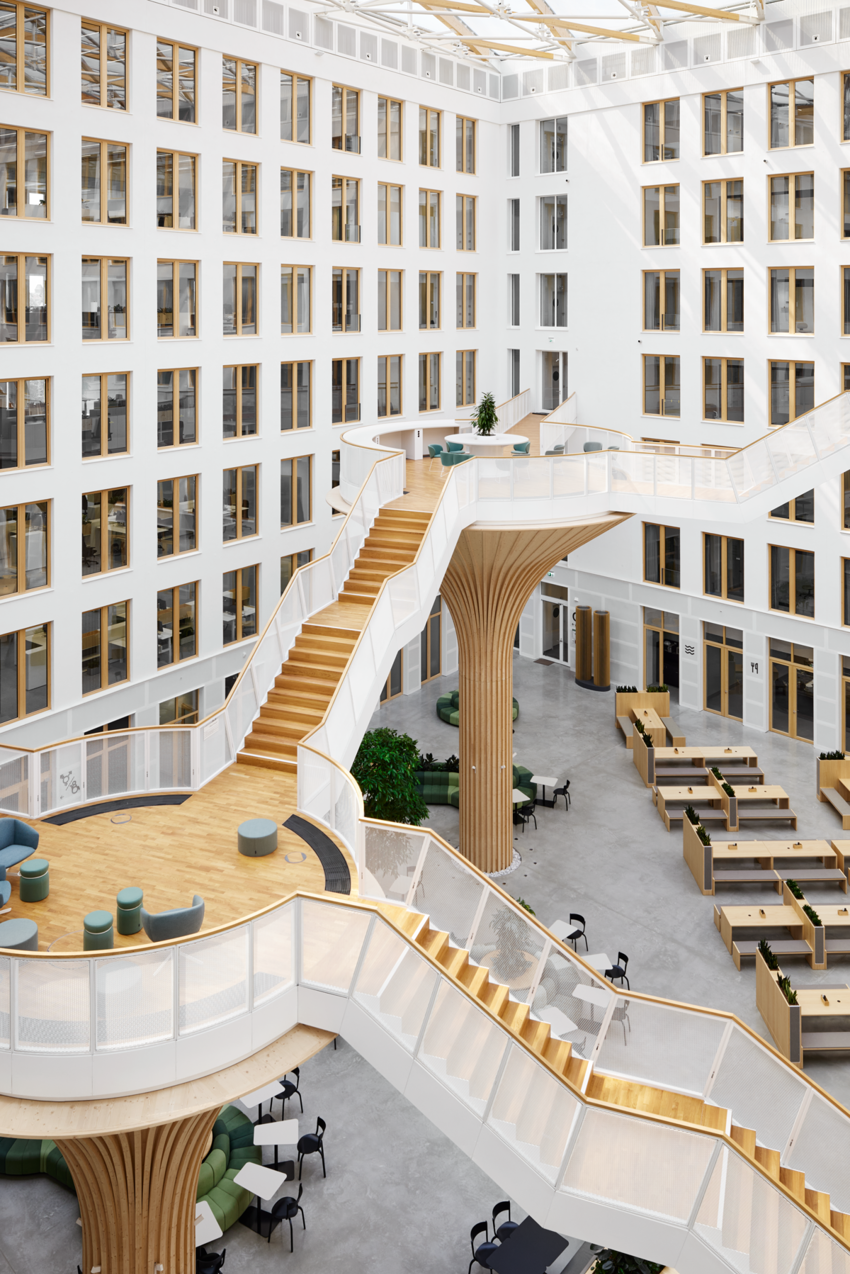 The atrium hall was equipped with specially manufactured displacement ventilation columns. This SLT special solution consisted of displacement air units in the lower area as well as jet nozzles in the upper area of the column. The ventilation elements were clad with a wooden structure and thus integrated into the theme of sustainability. This product ensures the supply of fresh air in the near and far areas of the diffuser and thus ensures a complete supply of fresh air to the occupied zone.