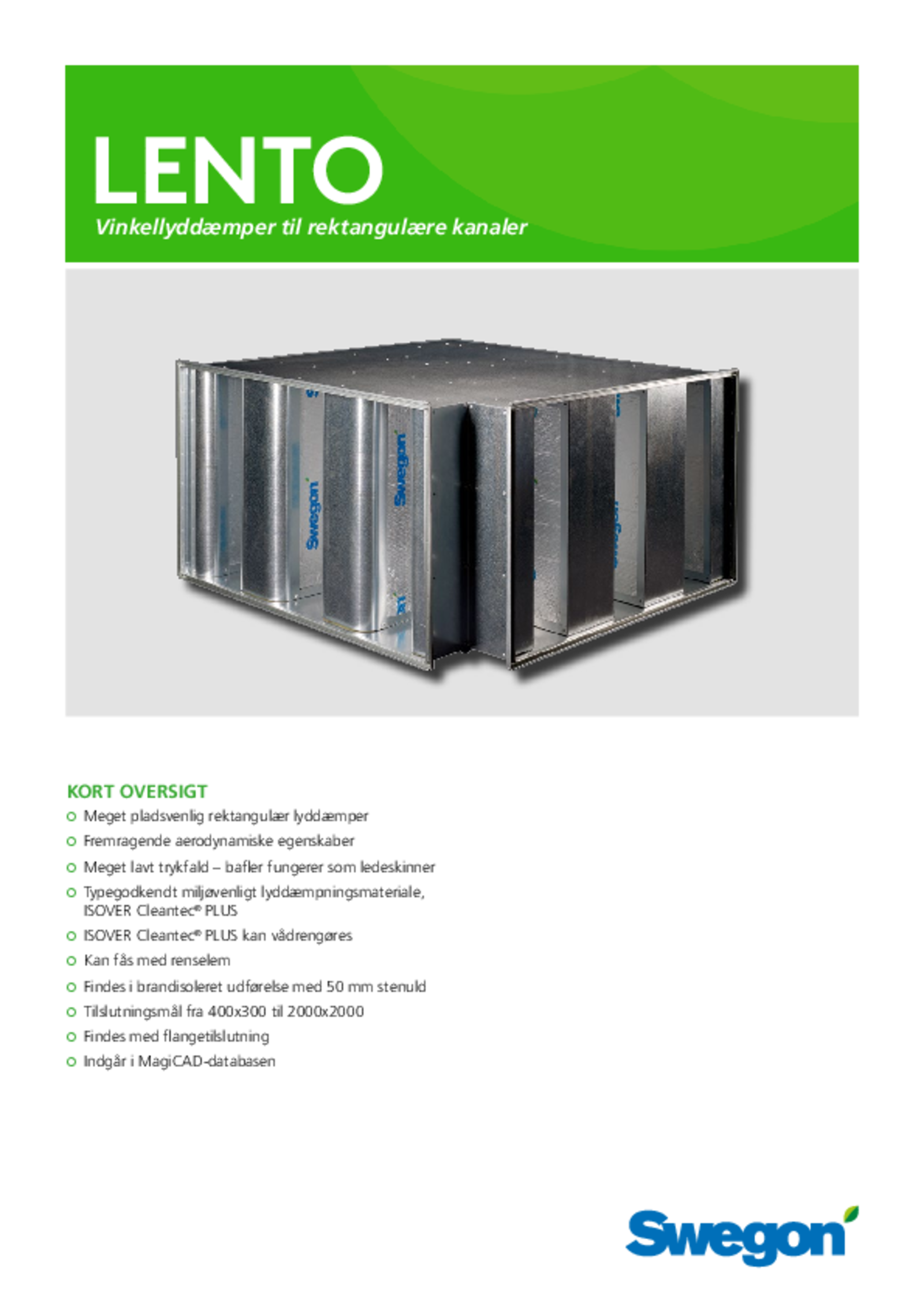 LENTO er, takket være den unikke udformning med tilslutning til sidebaflerne, velegnet til brug både i kanal og i direkte tilslutning til ventilationsaggregat.
