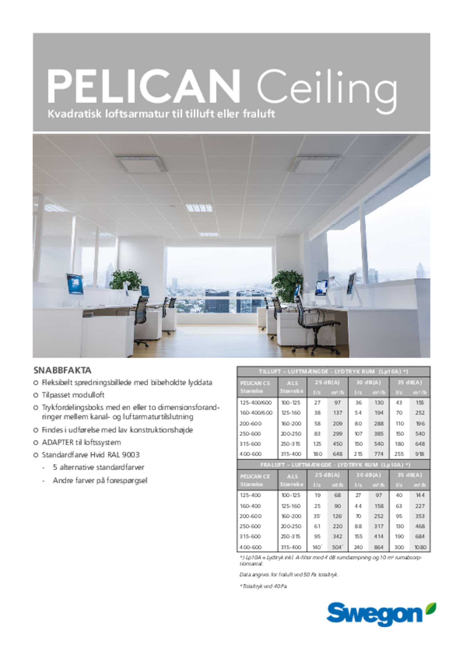 | PELICAN Ceiling Supply Størrelse | ALS Størrelse | 25 dB(A) | 30 dB(A) | 35 dB(A) | |||