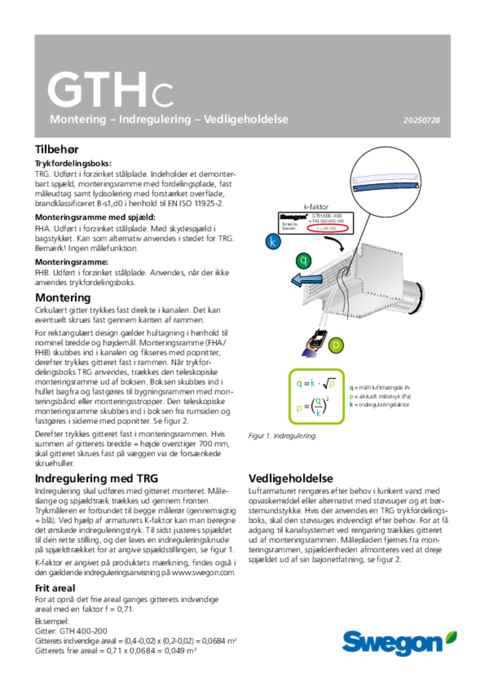 GTH er en rektangulær rist til tilluft. Beregnet til vægmontering. Risten har både vandrette og lodrette luftrettere, som let kan justeres til korrekt kastelængde og spredningsbillede for over- eller undertemperaturkonditionering, luftarmaturets placering, møbler i lokalet og hindringer for luftstrømmen. Ved regulering eller måling af kastelængde skal GTH benyttes med trykfordelingsboks TRG.