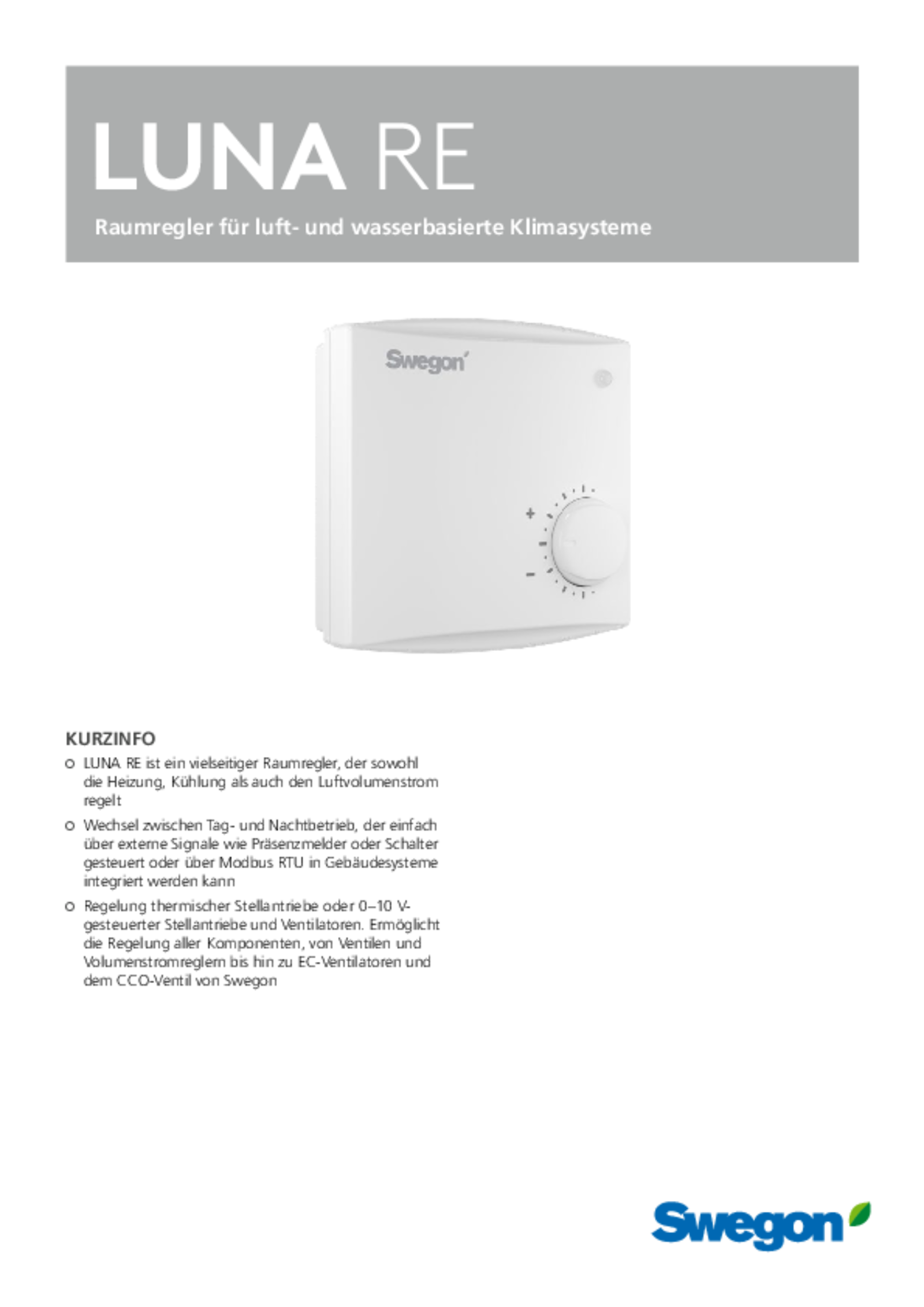 | Raumregler für luft- und wasserbasierte Klimasysteme (pdf 564.54kB) | LUNA RE e | Technischer Katalog | |