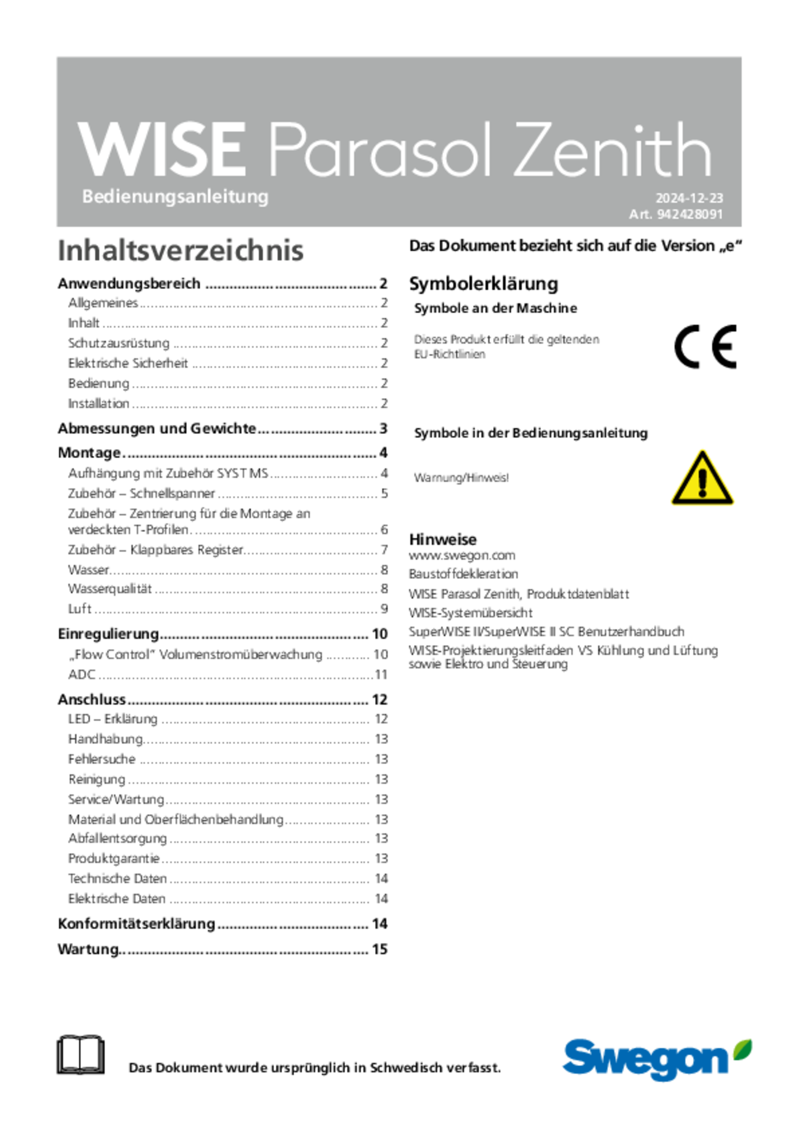 | Bedienungsanleitung (pdf 8.78MB) | WISE Parasol Zenith e | IOM-Handbuch | |