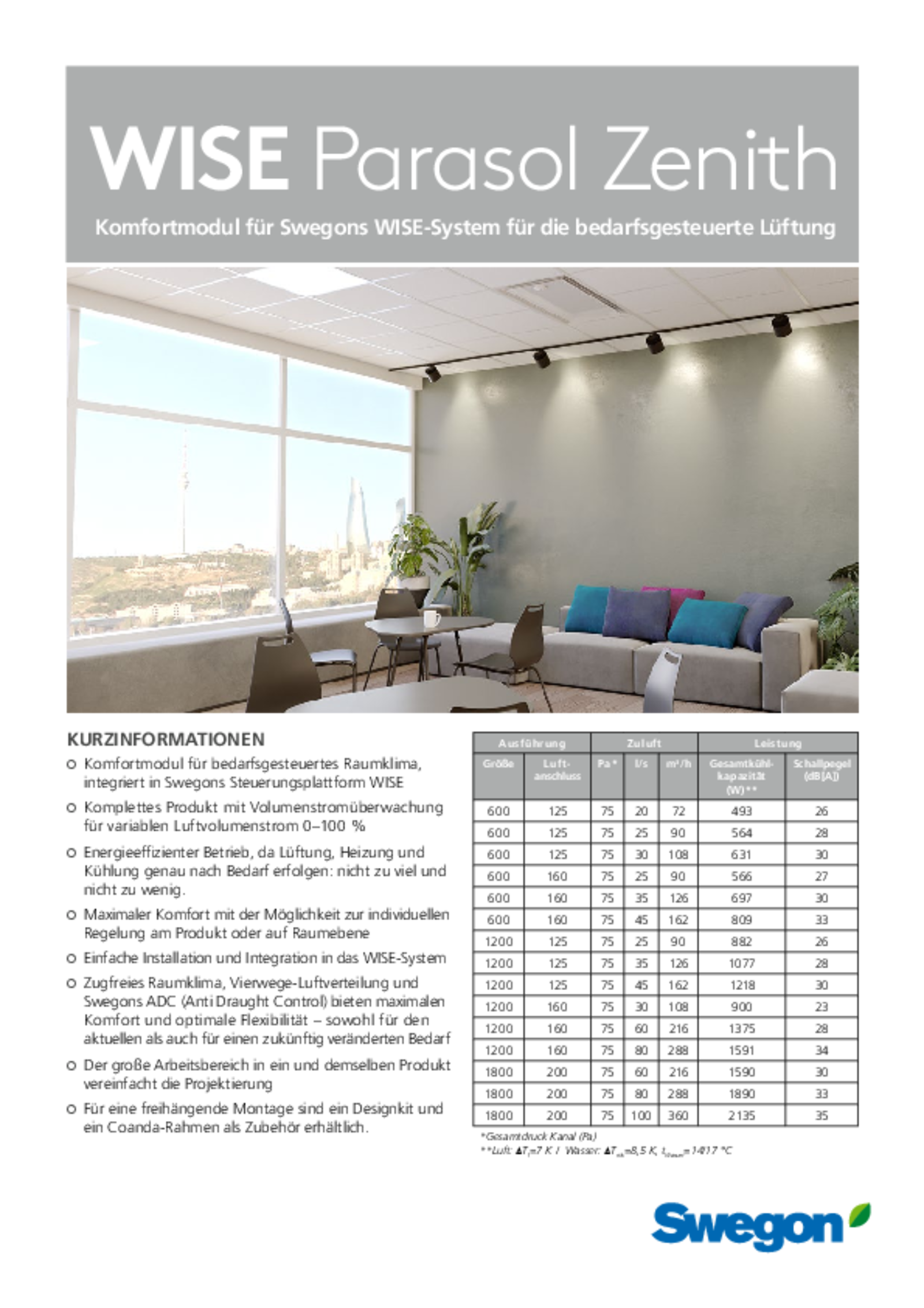| Komfortmodul für Swegons WISE-System für die bedarfsgesteuerte Lüftung (pdf 7.07MB) | WISE Parasol Zenith e | Technischer Katalog | |