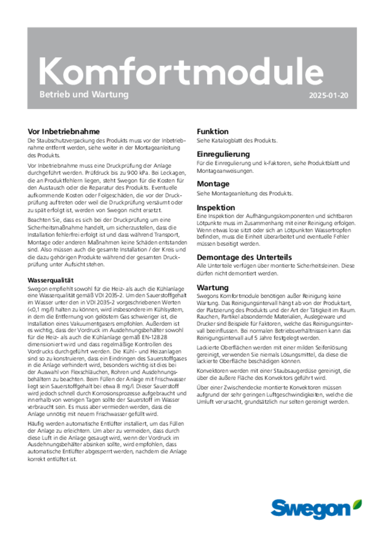 - Komfortmodul für bedarfsgesteuertes Raumklima, integriert in Swegons Steuerungsplattform WISE