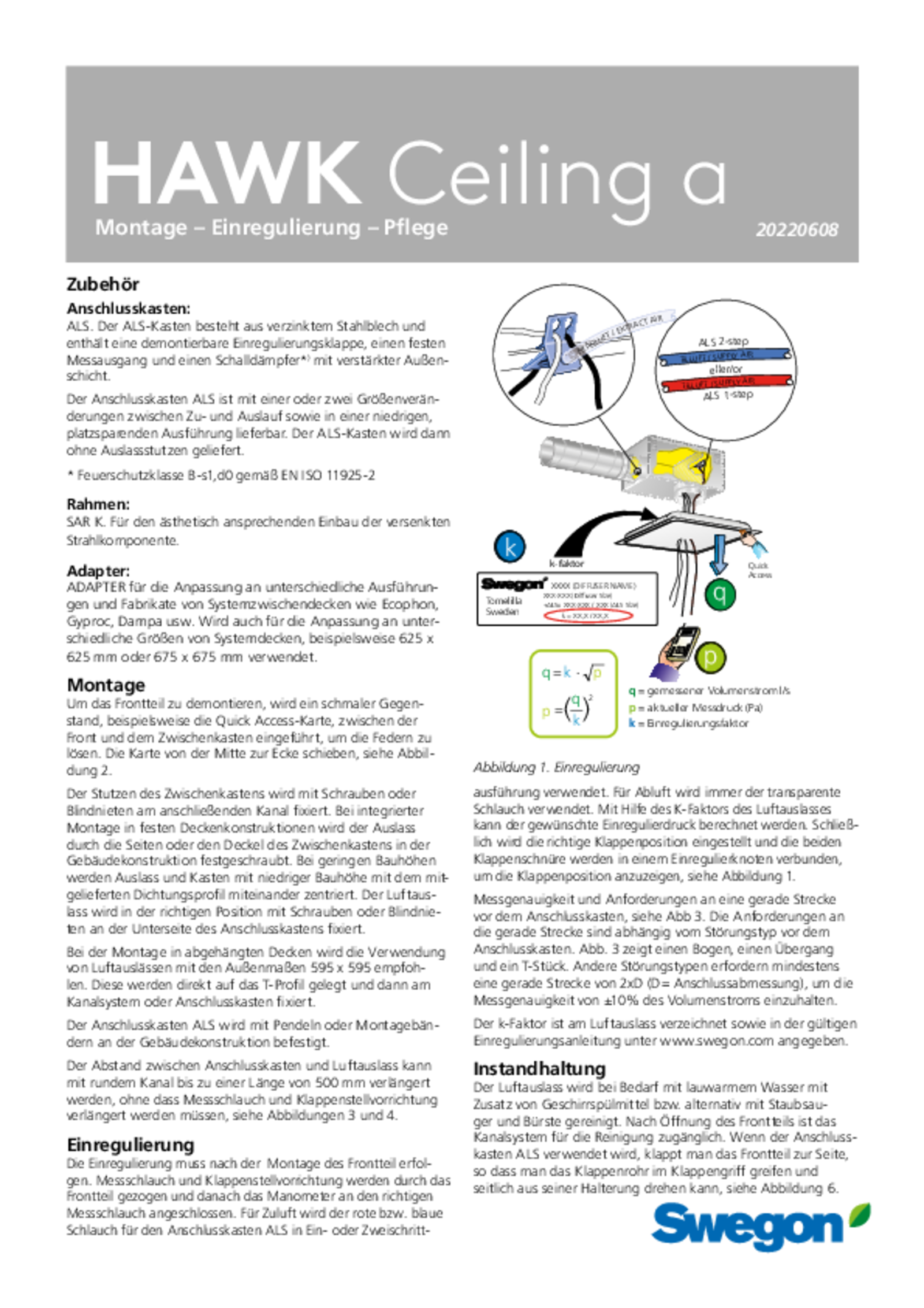 | Montage, Einregulierung, Wartung (pdf 1.62MB) | HAWK Ceiling a | IOM-Handbuch | |