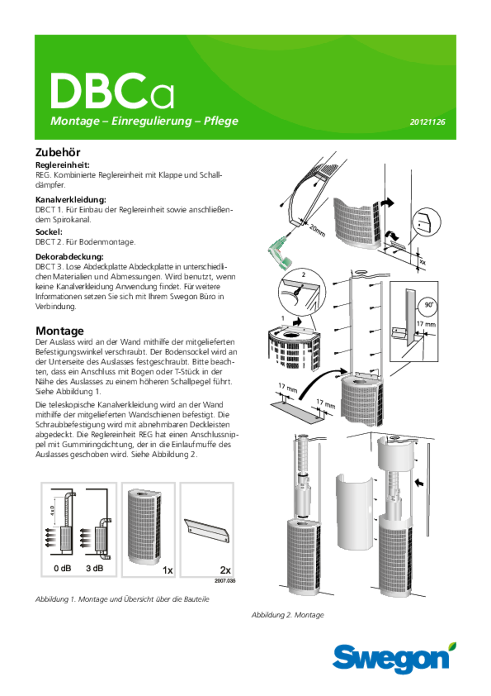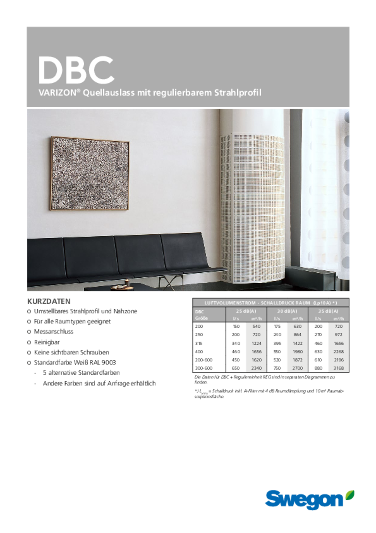 Der DBC ist ein kompletter, rechteckiger, bogenförmiger Quellauslass für Wandmontage. Das Gerüst besteht aus einer Rückseite mit Ober- und Bodenblechen sowie einem Luftverteilungsblech, das mit einer Anzahl drehbarer Verteilerplatten ausgerüstet ist. Das Oberblech besitzt eine runde Einlaufmuffe oder einen rechteckigen Einlaufstutzen, was von der Auslassgröße abhängig ist. Das Verteilerblech hat einen Inspektionsdeckel für den Zugang zum Kanalsystem. Auf dem Gerüst ist ein perforiertes Frontblech montiert, das auf der Rückseite verschraubt ist. Die Verschraubung ist nicht sichtbar und sitzt hinter einer demontierbaren Aluminiumleiste. Hinter dieser Leiste ist der Messanschluss angebracht.