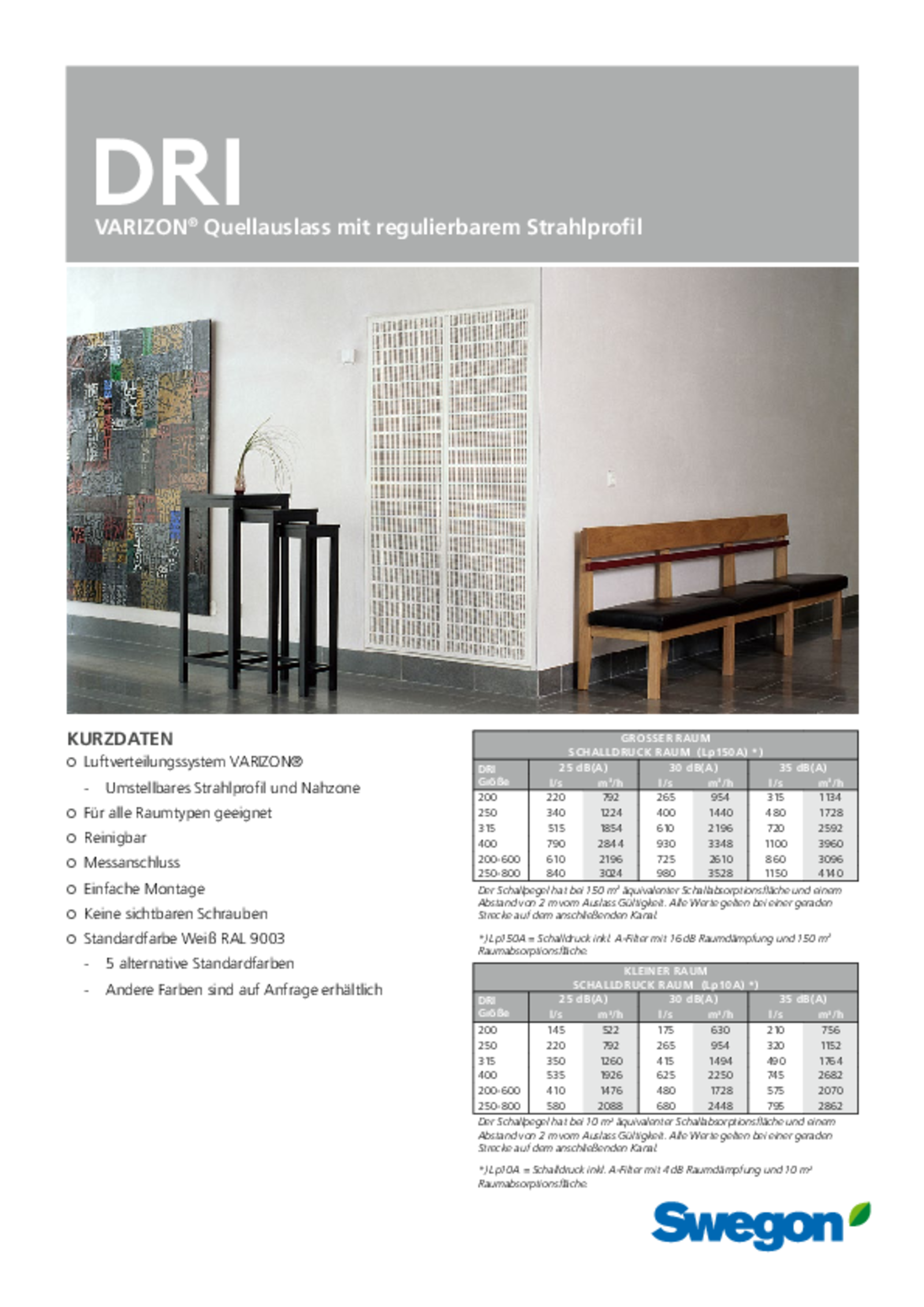 Bei DRI handelt es sich um einen kompletten rechteckigen Verdrängungsauslass zur Platzierung an Wand oder Decke für die Aufputzmontage oder den bündigen Einbau. Das Gerät kann einen grossen Luftvolumenstrom mit niedriger Geschwindigkeit in den Aufenthaltsbereich leiten. Das Verteilungsbild ist aufgrund der leicht verstellbaren Luftverteiler des Auslasses leicht anpassbar.