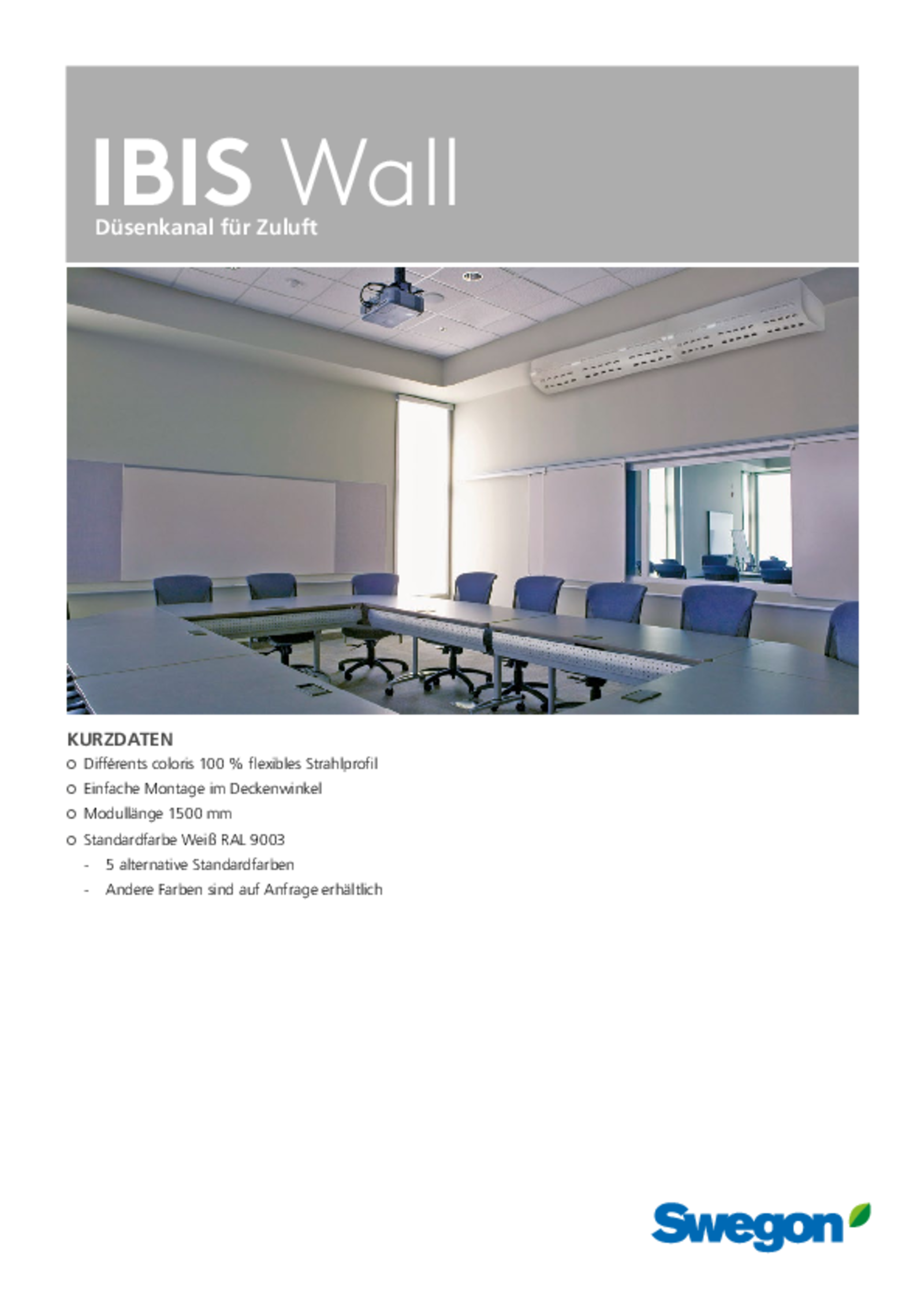 IBIS Wall-Kanalluftauslass für einen konstanten oder variablen Luftvolumenstrom. Die Luftzufuhr kann mit über- oder untertemperierter Luft erfolgen. Das Verteilungsbild lässt sich aufgrund der drehbaren Düsen zwischen horizontaler und vertikaler Dispersion beliebig variieren.