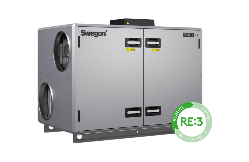 Die in Kvänum gefertigten Lüftungsgeräte GOLD/SILVER C sind ein gutes Beispiel für das Segment RE:duce. Die Lüftungsgeräte werden zum Teil aus XCarb® gefertigt, einem Stahl mit einem Recycling-Anteil von mindestens 75 %. Dieser Stahl wird in Elektrolichtbogen-Öfen verarbeitet, die ausschließlich mit erneuerbarer Energie betrieben werden. Das Ergebnis ist ein Stahl, der im Herstellungsprozess im Vergleich zu neuem Stahl ca. 70 % CO2-Emissionen-Emissionen einspart und einen 10 % niedrigeren GWP-Wert hat. Damit enthalten GOLD/SILVER C-Lüftungsgeräte nun etwa 15 % recyceltes Material, das bedeutet bis zu 10 % weniger verkörperten Kohlenstoff. Damit war Swegon der erste Hersteller, der recycelten Stahl standardseitig in Lüftungsgeräten eingesetzt hat.