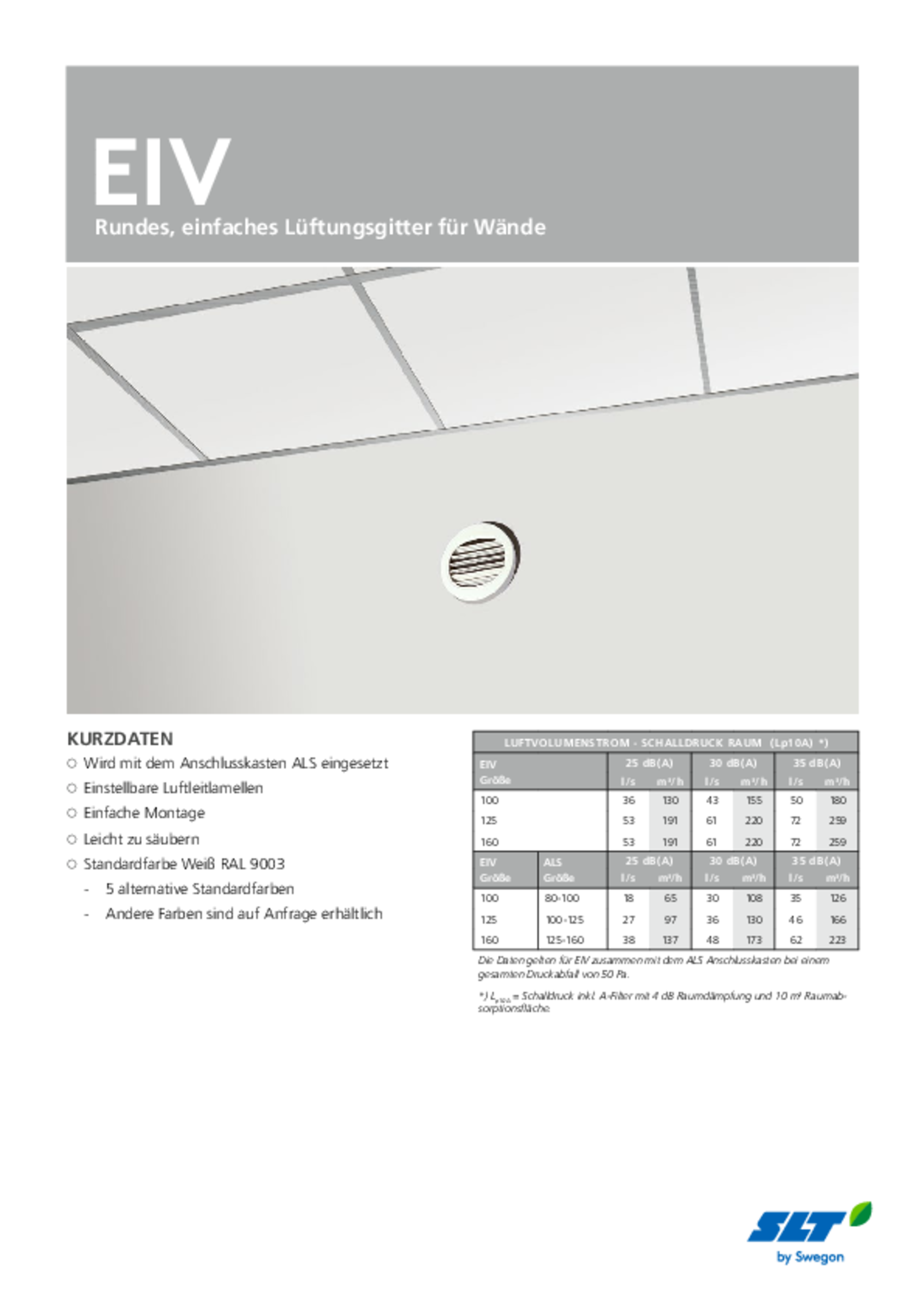 Bei EIV handelt es sich um ein rundes Gitter mit rundem Anschluss zur Wandmontage. EIV zeichnet sich durch einstellbare Luftverteiler für die Anpassung von Verteilungsbild und Luftstromlänge aus. EIV lässt sich für eine horizontale oder vertikalen Einstellung des Verteilungsbilds drehen. Wir empfehlen für eine optimale Leistung die Verwendung mit dem multifunktionalen ALS-Anschlusskasten.
