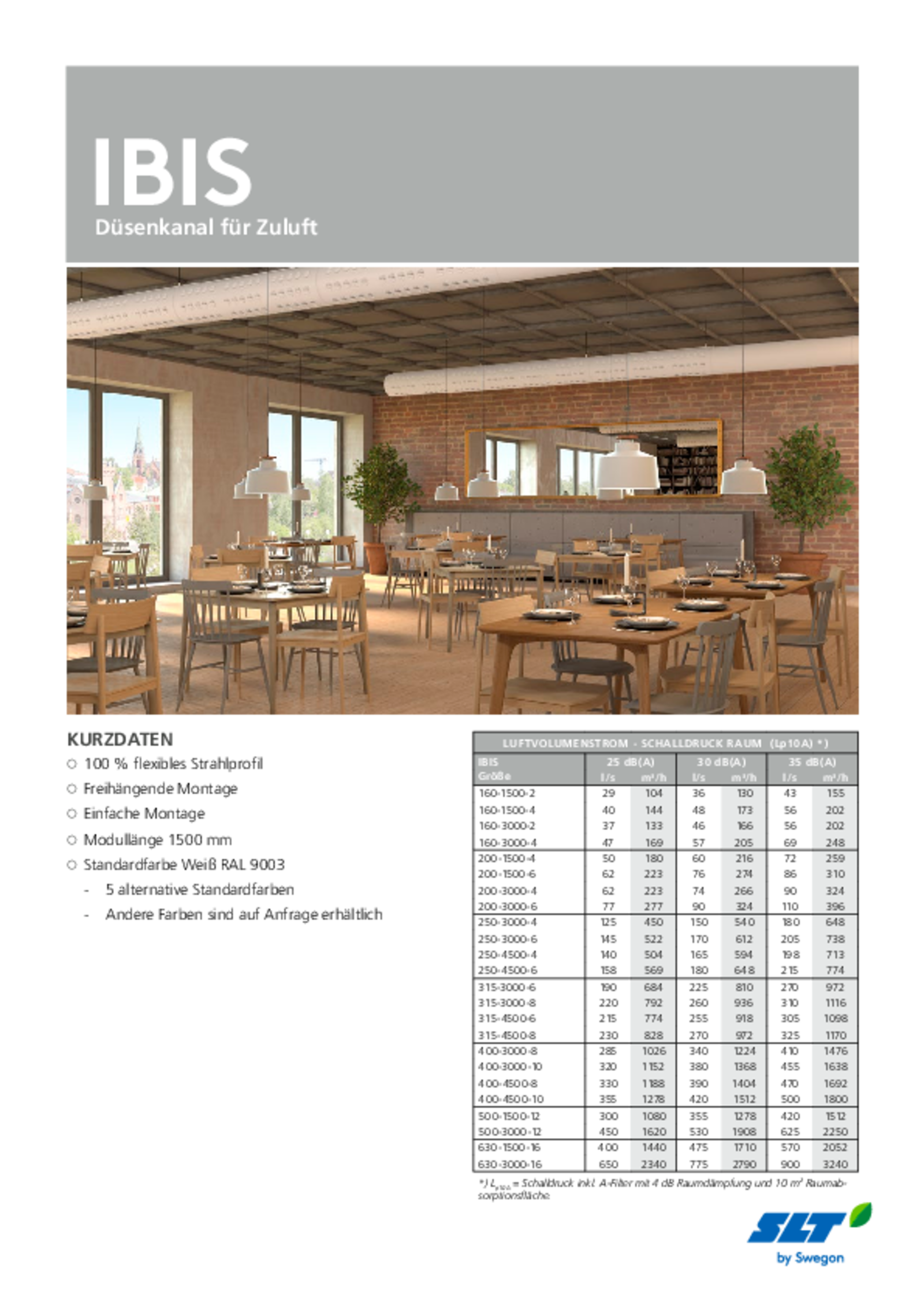 Der Düsenkanal IBIS hat einen Durchmesser, der den Standardkanalabmessungen entspricht. IBIS hat aerodynamisch geformte Düsen mit einem großen Induktionseffekt. IBIS Ø160 sowie IBIS Ø200 sind mit den kleinen Swegon-Düsen ausgerüstet. Der Düsenkanal ist serienmäßig mit einer Anzahl verschiedener Düsenreihen lieferbar. Auf der Oberseite befindet sich ein in Längsrichtung verlaufende integrierte Leiste, um den Düsenkanal von der Decke abzupendeln.