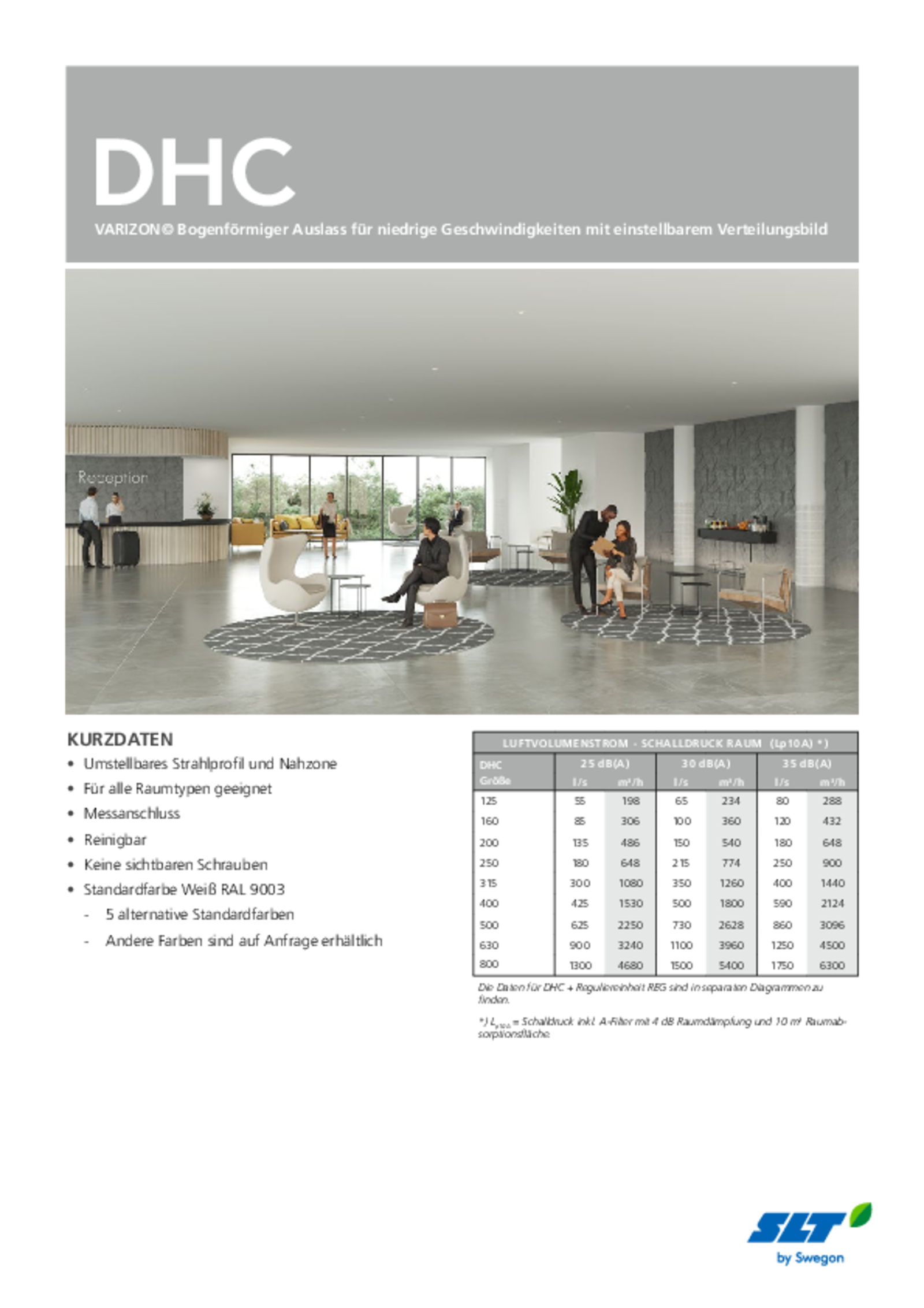 DHC ist ein kompletter, halbrunder Verdrängungsauslass zur Wandmontage, der mit niedriger Geschwindigkeit den Aufenthaltsbereich mit Luft versorgt. Das Verteilungsbild lässt sich durch einstellbare Düsen einfach anpassen. Als Zubehör sind Bodensockel, Kanalverkleidung und Reglereinheit verfügbar.