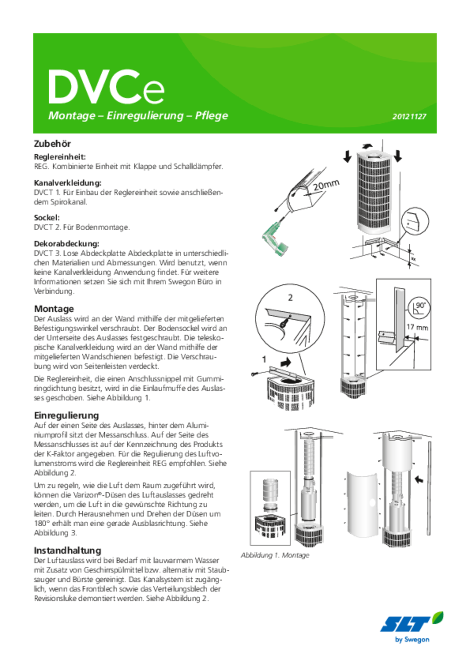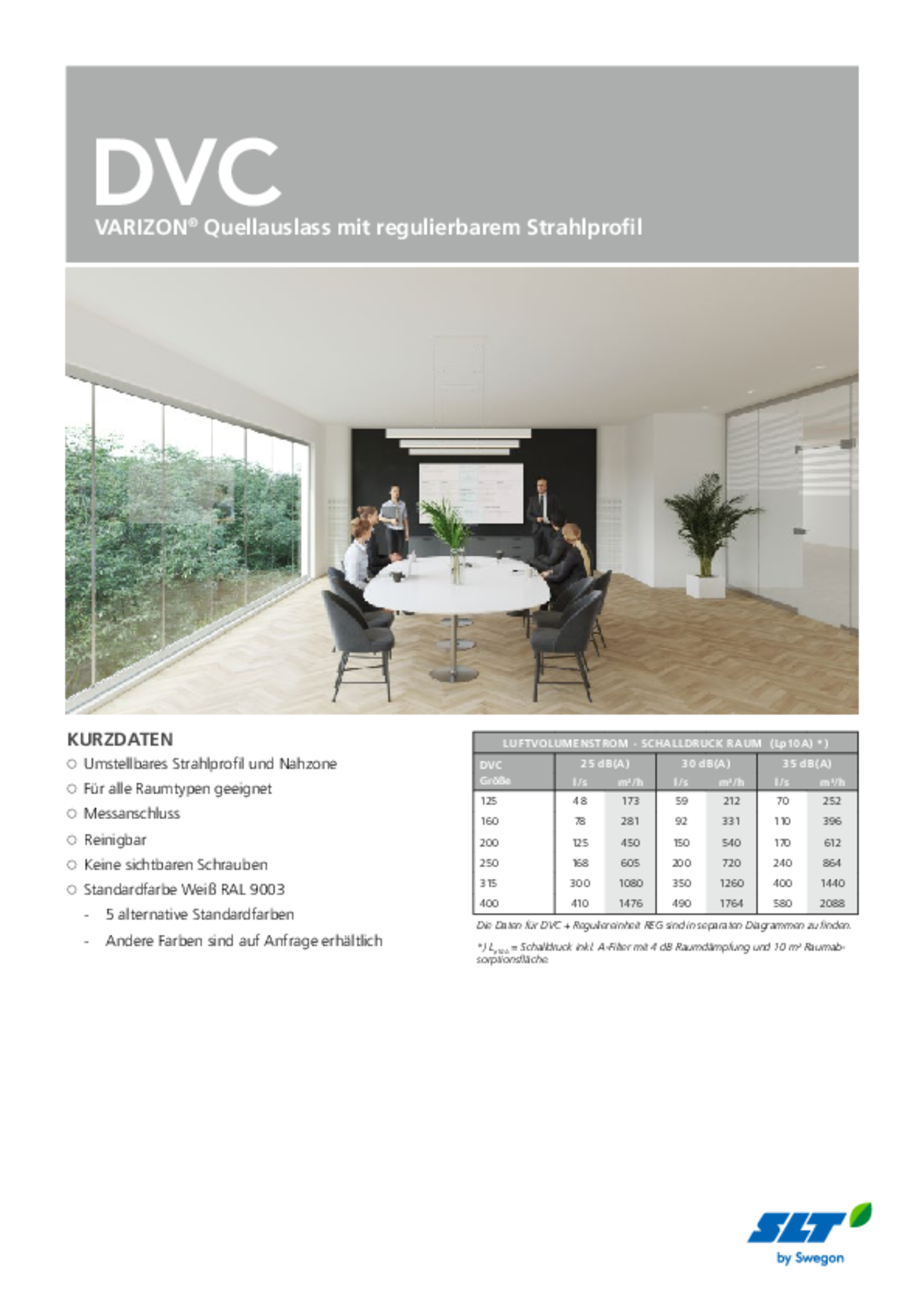 DVC ist ein abgerundeter Quellluftauslass für die Raumecke zur Wandmontage, , der mit niedriger Geschwindigkeit den Aufenthaltsbereich mit Luft versorgt. Das Strahlprofil ist dank der drehbaren Luftgleichrichter des Auslasses leicht umstellbar. Als Zubehör sind Bodensockel, Kanalverkleidung und Reglereinheit verfügbar.