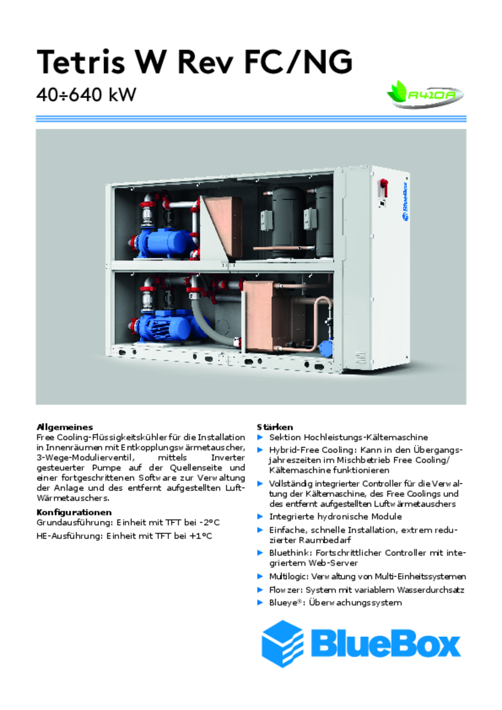 Die Serie TETRIS W Rev FC/NG besteht aus hocheffizienten wassergekühlten Freikühl-Kaltwassererzeugern zur Aufstellung im Gebäude. Ein zusätzlicher Plattenwärmetauscher, für den glykolfreien Verbraucherkreislauf, in Kombination mit einem stufenlosen 3-Wege-Ventil und einer drehzahlgeregelten Kühlwasserpumpe ermöglicht den gleitenden Freikühlbetrieb.