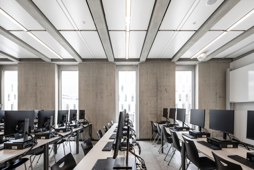 Unsere Module und Systeme bieten neben einer hohen thermischen Leistung und vielseitigen Installationsmöglichkeiten auch gute akustische Eigenschaften – nicht ganz unwichtig, wenn es darum geht, dem Unterricht zu folgen. Die Hybridsysteme bieten noch ein Effizienzplus: Durch die Einbeziehung der Gebäudemasse über die Betondecke kann die Massenspeicherleistung noch weiter gesteigert werden. Damit lassen sich Betriebskosten und CO2-Ausstoß erheblich senken.