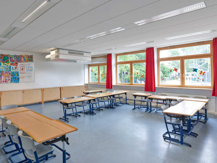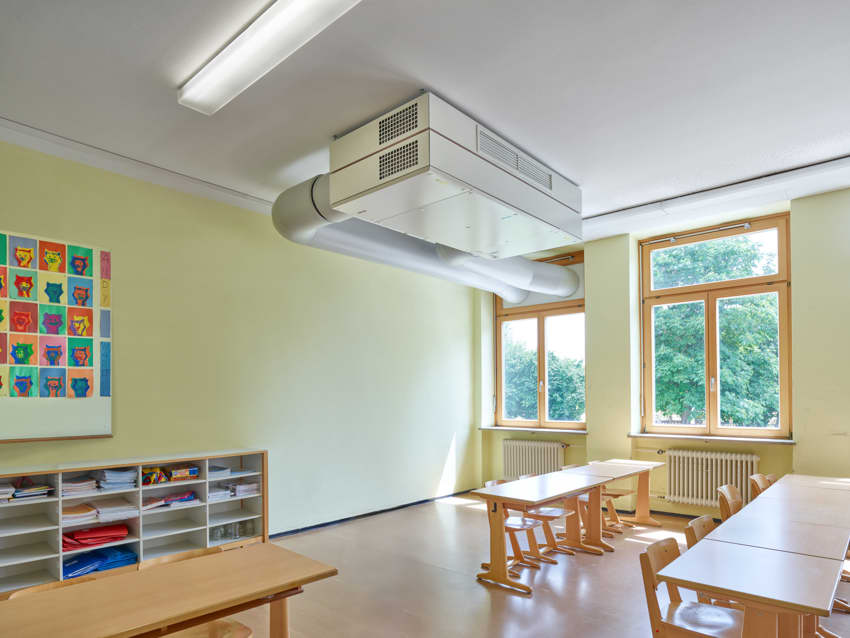 Im Gegensatz zur unkontrollierten Fensterlüftung sorgen die raumlufttechnischen Geräte für einen angemessenen Luftaustausch und senken durch den hohen Grad der Wärmerückgewinnung die Energiekosten des Schulbetriebs. Die kompakte Bauweise der Anlagen ist für eine einfache und schnelle Montage wichtig. Zudem können die CLASS UNITs teilweise in die Decke integriert werden, um Platz zu sparen.