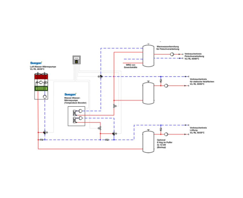 In diesen hohen Temperaturen, die die Metzgerei benötigte, lag die Herausforderung: Standard-Luft-Wasser-Wärmepumpen eignen sich für die Erzeugung von niedrigen bis mittleren Temperaturen, beispielsweise um Wohngebäude oder Lebensmittelmärkte zu beheizen. Benötigt ein Gebäude sehr hohe Vorlauftemperaturen, stoßen diese Standard-Wärmepumpen an ihre Grenzen. Swegon entwickelte ein Konzept, das verschiedene Wärmepumpen kombiniert. Neben den Luft-Wasser-Wärmepumpen kommen in diesem Konzept spezielle, sogenannte Wasser-Wasser-Wärmepumpen (Temperature-Booster) zum Einsatz, die hohe Wassertemperaturen erzeugen. Diese Wärmepumpen arbeiten mit dem Kältemittel Propan (R290) und erreichen Vorlauftemperaturen von bis zu 75 °C.