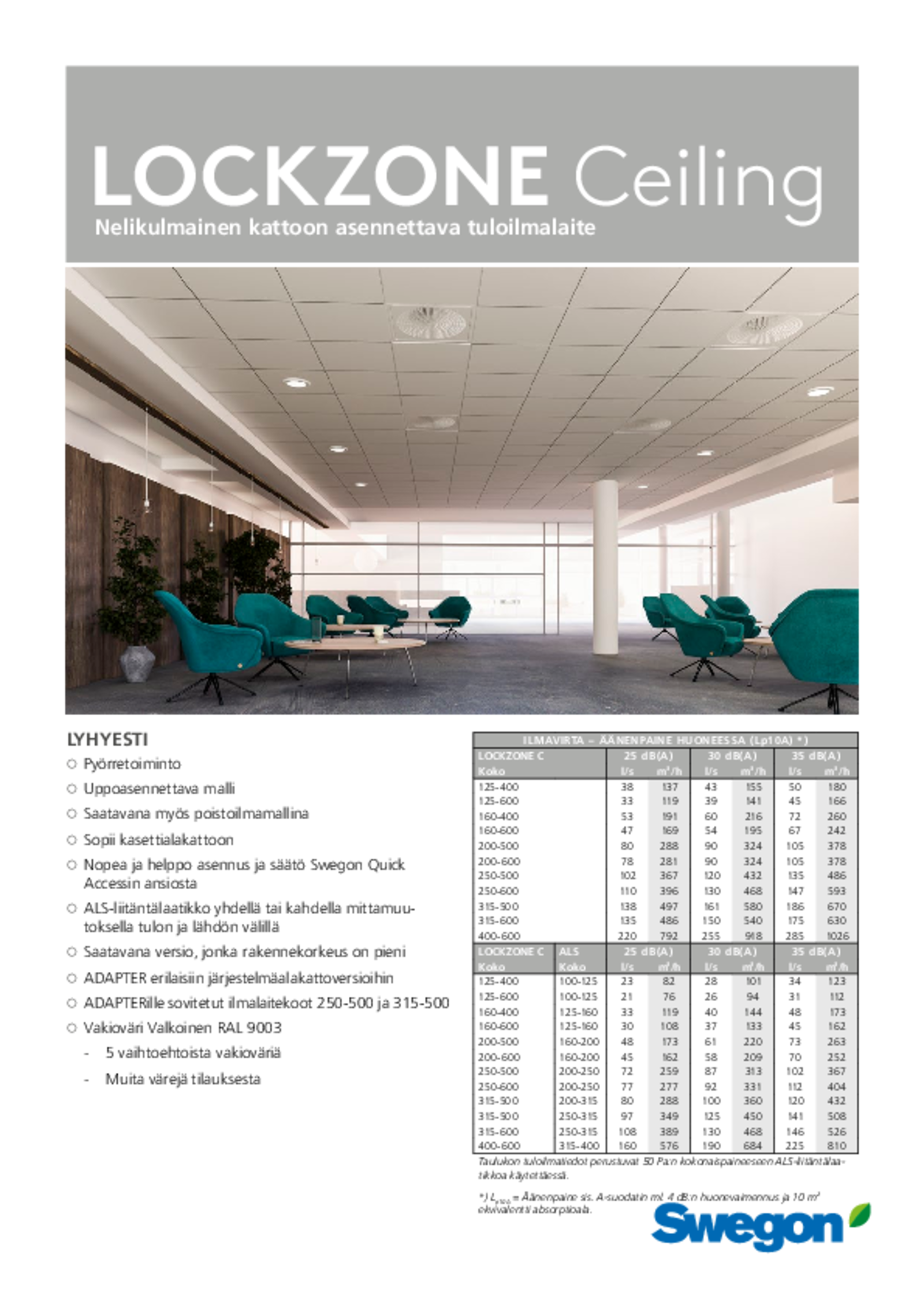 | Nelikulmainen kattoon asennettava tuloilmalaite (pdf 2.44MB) | LOCKZONE Ceiling a | Tekninen luettelo | |