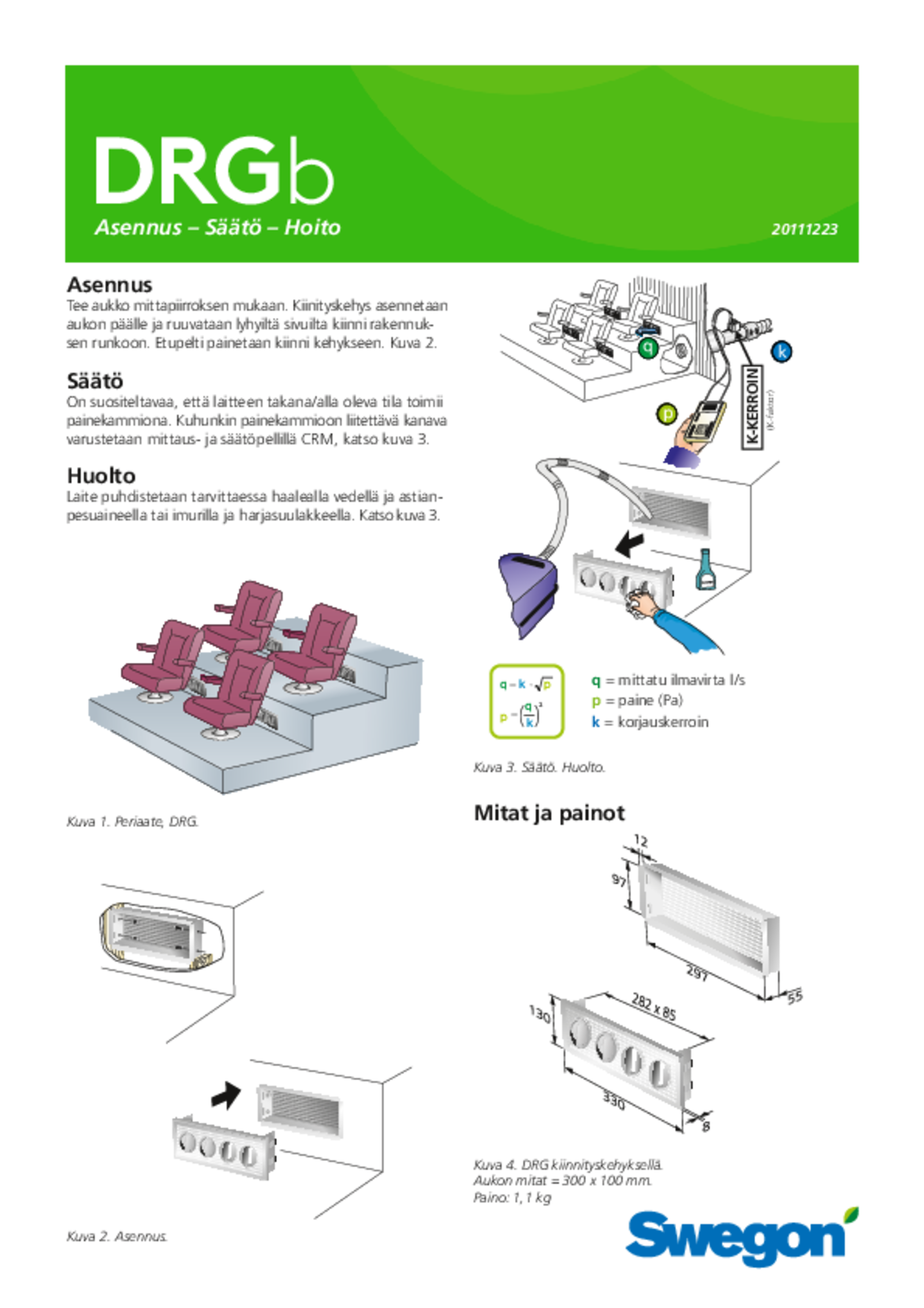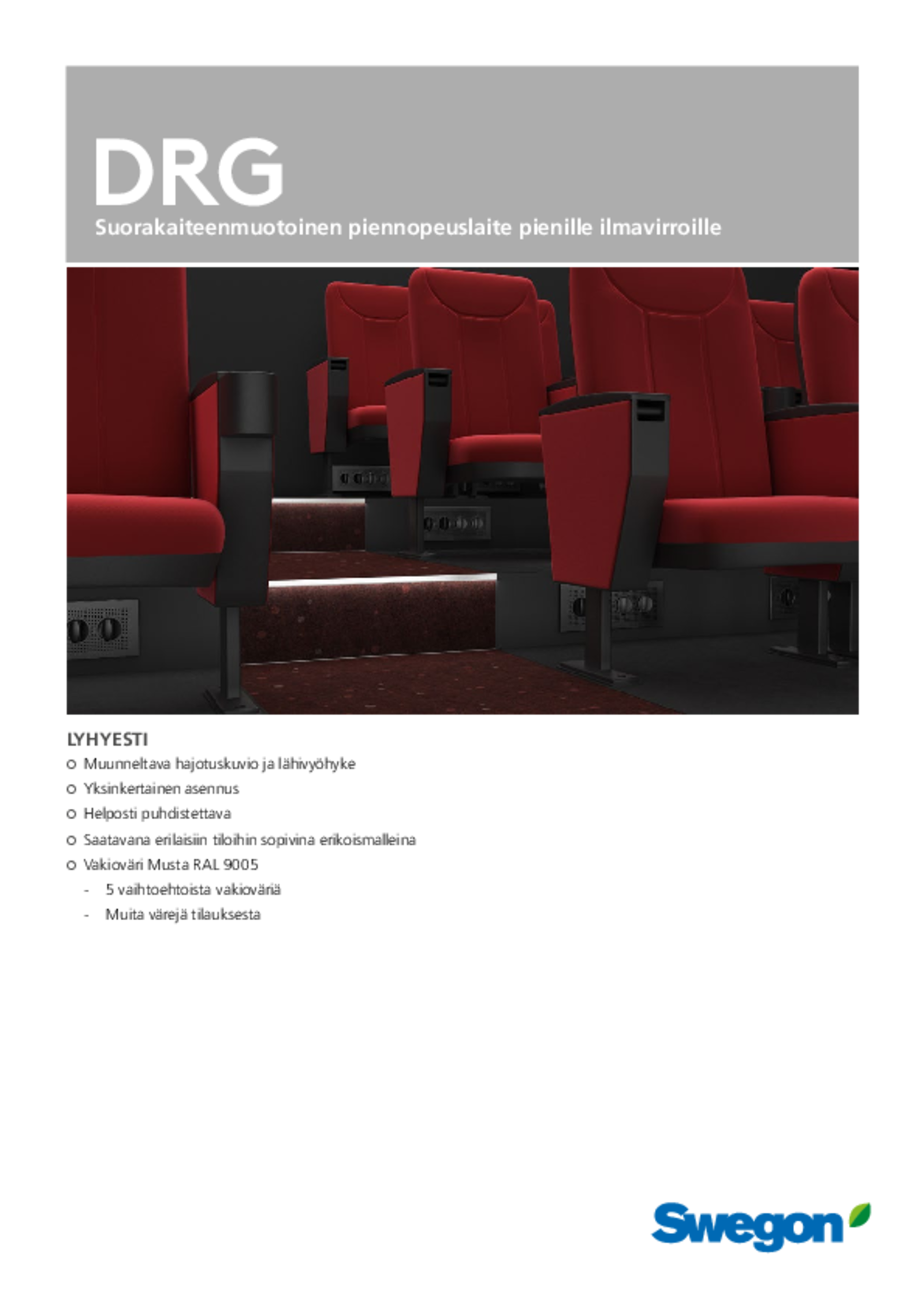 DRG on nelikulmainen piennopeuslaite pienille ilmavirroille, joka puhaltaa ilmaa tilaan pienellä nopeudella. Hajotuskuvio on helppo säätää säädettävien VARIZON®-suuttimien ansiosta. Se sopii hyvin tiloihin, joissa useita pieniä laitteita voidaan sijoittaa eri paikkoihin parasta mahdollista ilmanjakoa varten, esim. salit, teatterit, elokuvateatterit ja luentosalit. Ilmanjakolaitteet asennetaan istuinten alle portaiden pystypintaan.