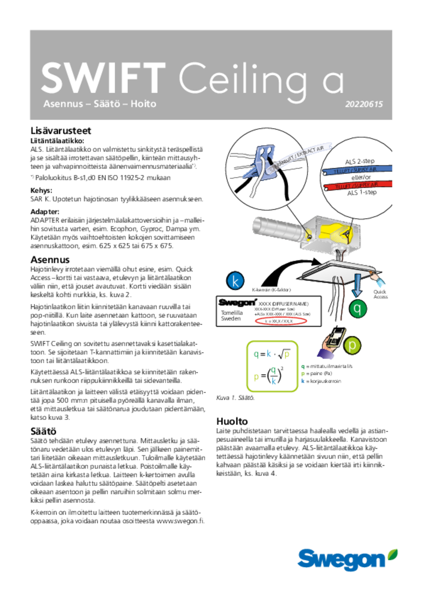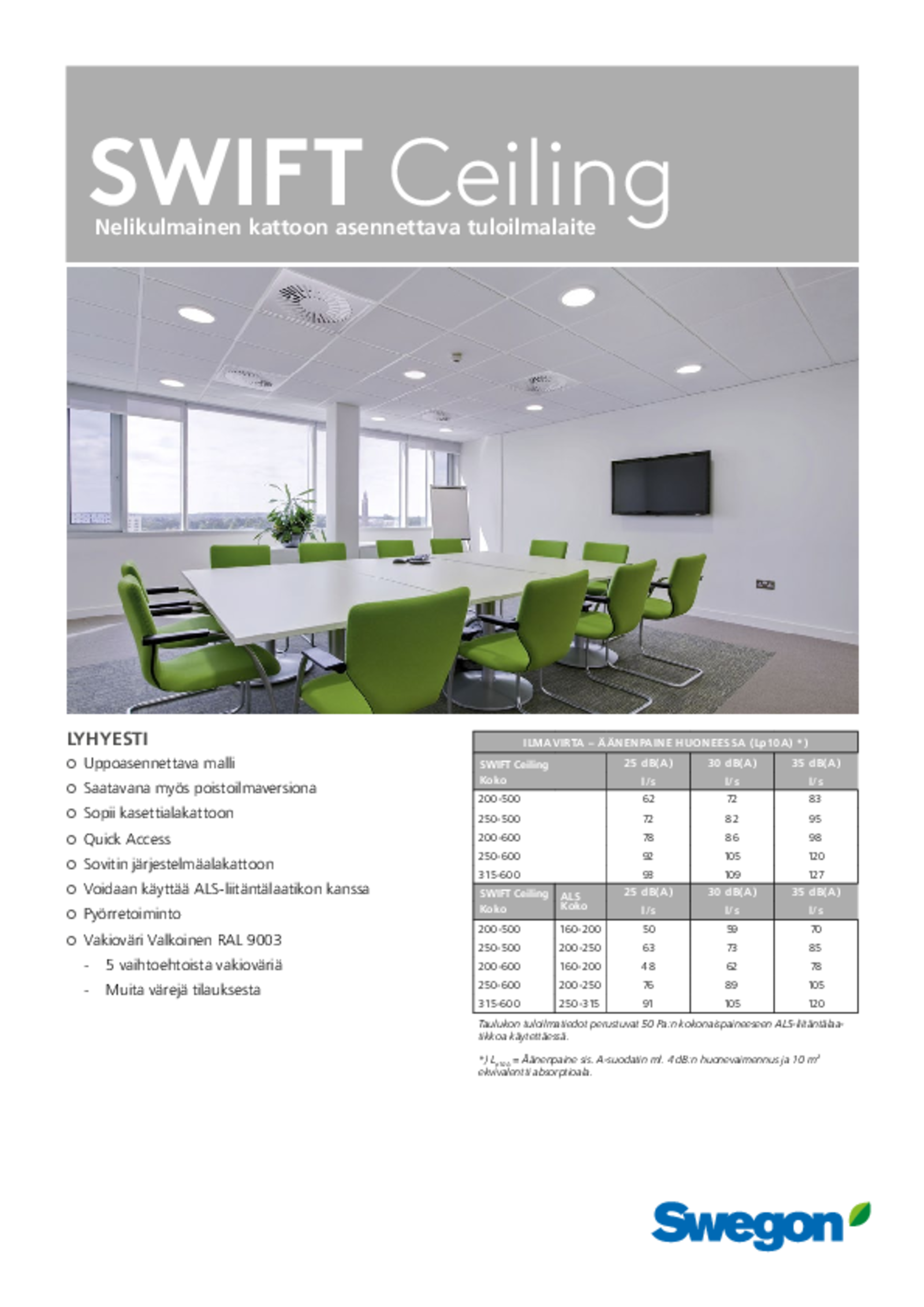 Neliönmuotoinen laite voidaan asentaa kasettialakattoon, mutta se soveltuu myös kiinteisiin alakattoihin. Rei'itys on muotoiltu suuria ilmavirtoja varten. Laite on pika-avattava (Quick Access), joten se voidaan avata ja sulkea nopeasti asennuksen, säädön ja puhdistuksen yhteydessä.
