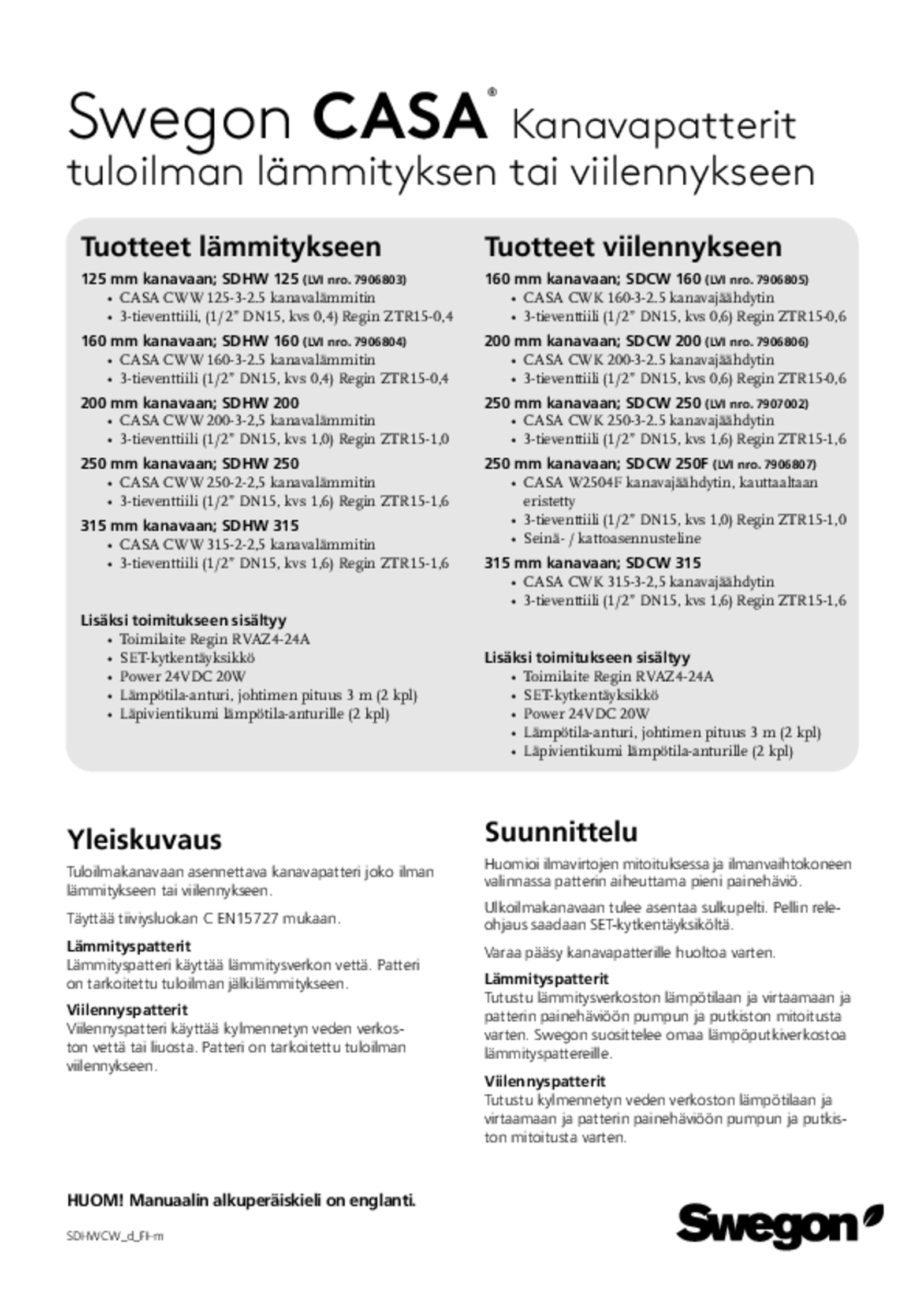 Tuloilmakanavaan asennettavan lämmityspatterin avulla voidaan hyödyntää vesikiertoista lämmitysjärjestelmää tuloilman lämmittämiseen. Tämä on usein taloudellisempaa kuin sähkövastuksella lämmittäminen. Patteria ohjataan automaattisesti ilmanvaihtolaitteen CASAohjausjärjestelmällä ja asetuksia voidaan muuttaa CASA -ohjauspaneelin kautta. Pienimpien pattereiden (Ø125 ja 160mm) korkeus ainoastaan 255 mm, joka mahdollistaa asennuksen alaslaskettuun kattoon.