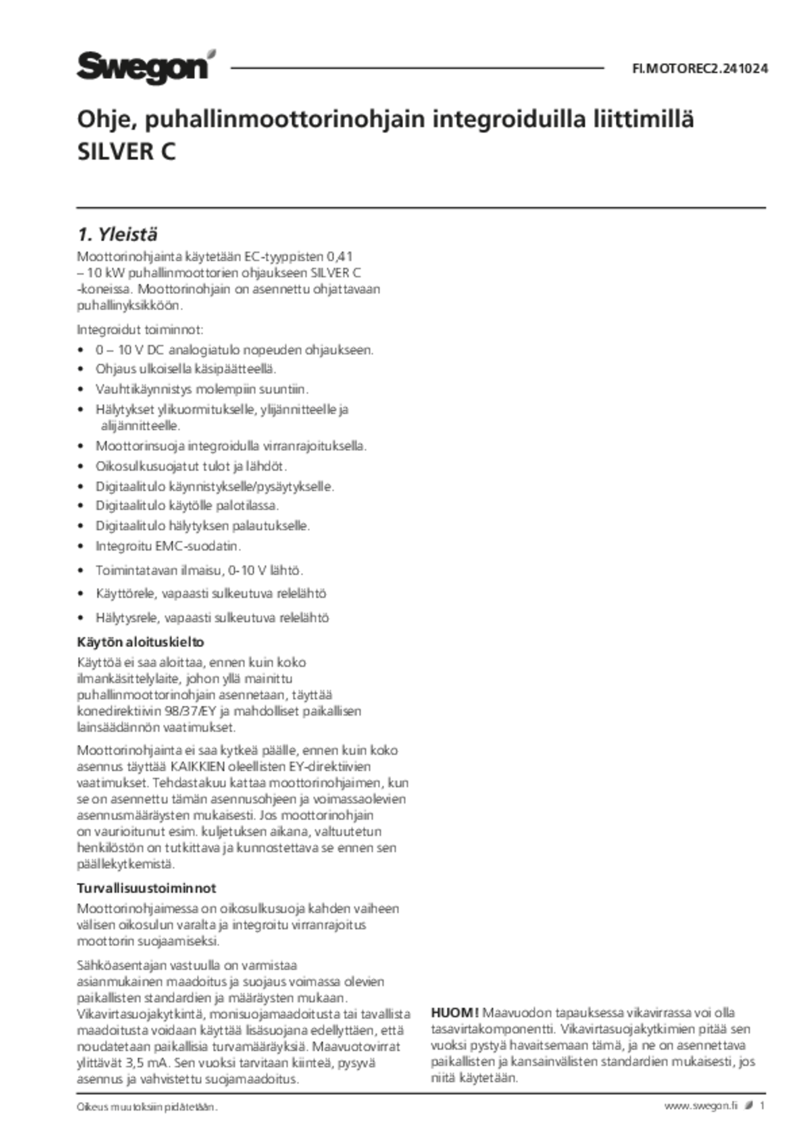 | Puhallinmoottorinohjain integroiduilla liittimillä (pdf 497.04kB) | SILVER C | Asennus- ja huoltomanuaali | |