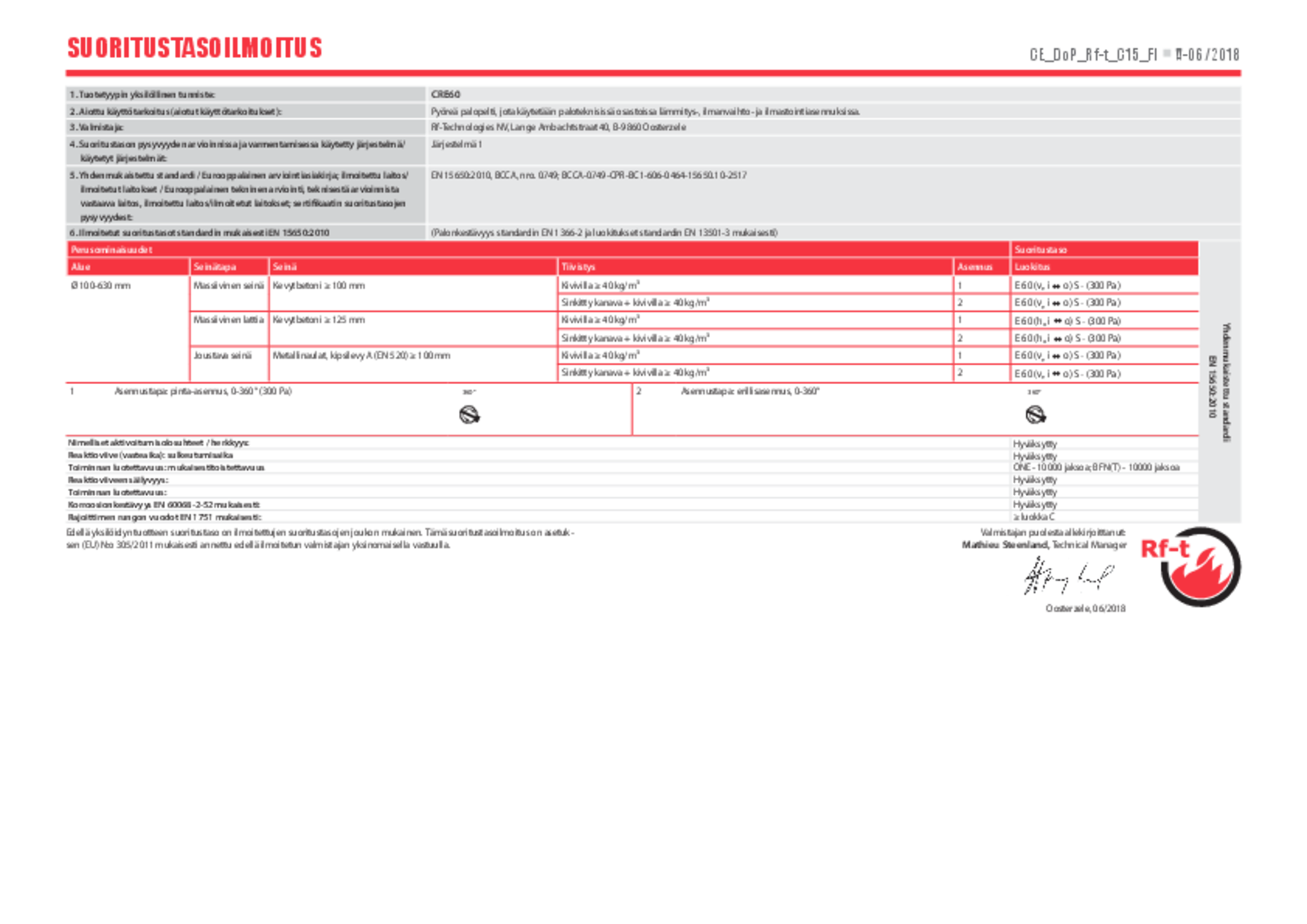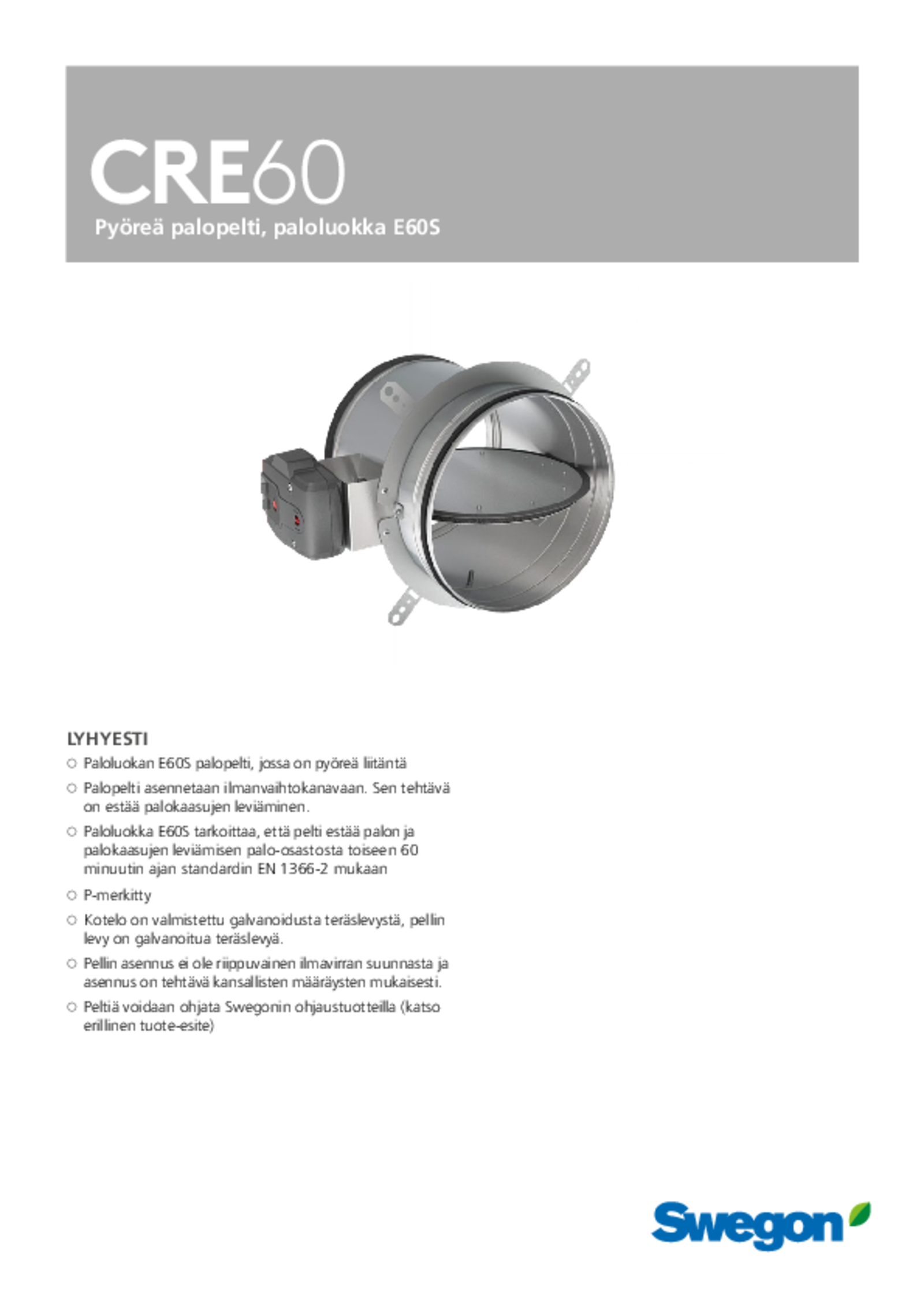 • CRE60 on palopelti paloluokassa E60S, jossa on pyöreä liitäntä Ø100–630 mm