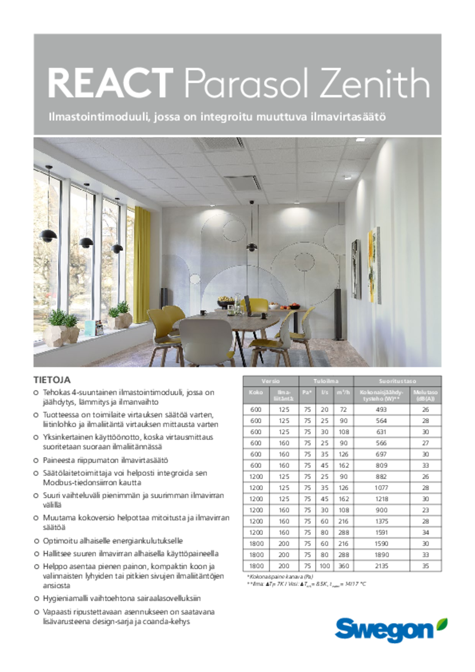 | Ilmastointimoduuli, jossa on integroitu muuttuva ilmavirtasäätö (pdf 6.07MB) | REACT Parasol Zenith e | Tekninen luettelo | |