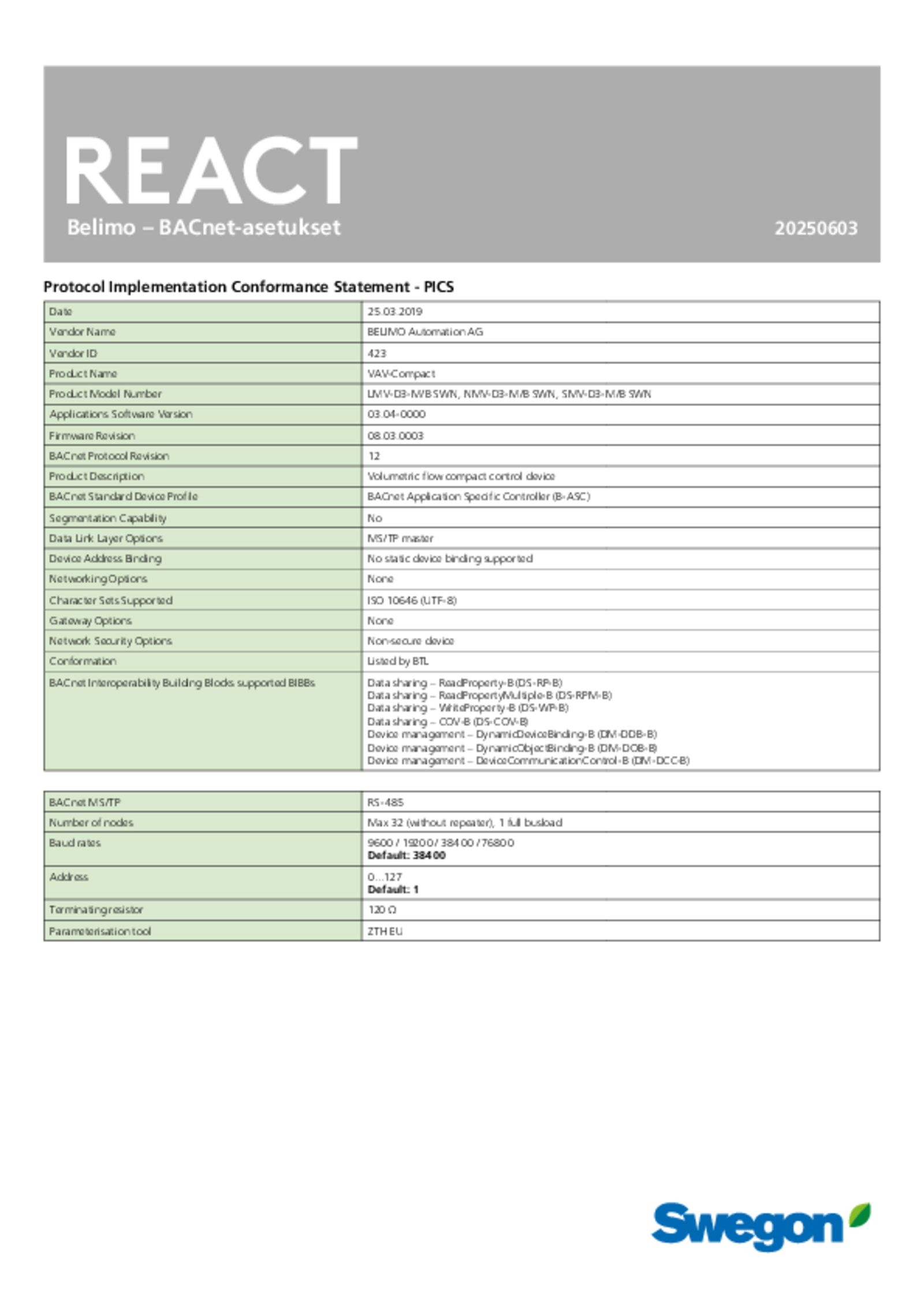 | BACnet-asetukset - Belimo (pdf 81.88kB) | REACT V BBAC | Asennus- ja huoltomanuaali | |