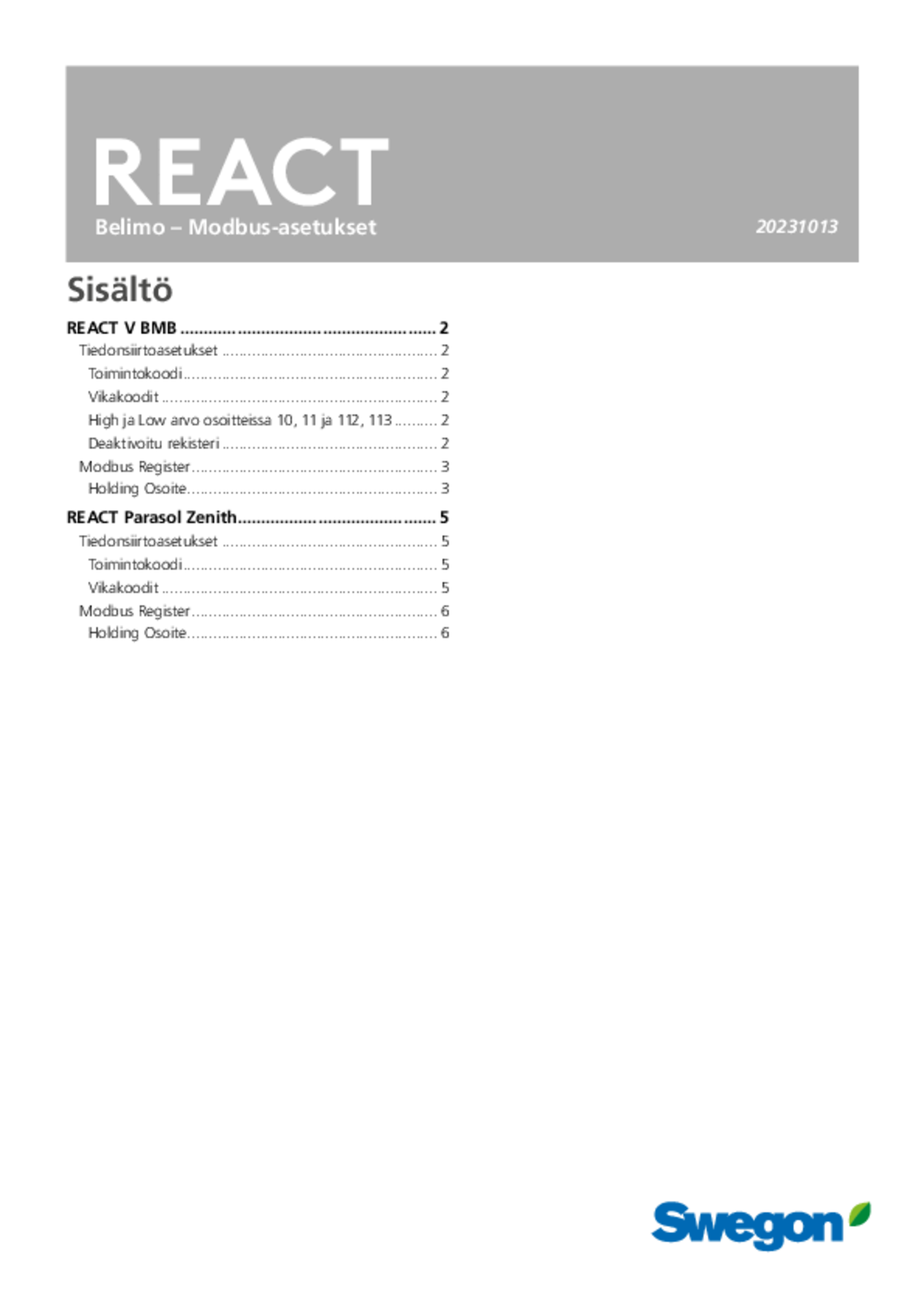 | Modbus-asetukset – Belimo (pdf 148.65kB) | REACT V BMB, REACT Parasol Zenith | Asennus- ja huoltomanuaali | |