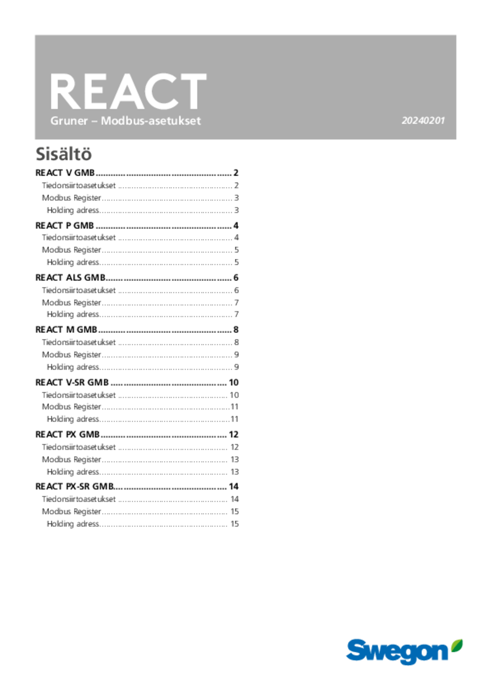 | Modbus-asetukset – Gruner (pdf 192.88kB) | REACT ALS GMB, REACT M GMB, REACT P GMB, REACT PX GMB, REACT PX-SR GMB, REACT V GMB, REACT V-SR GMB | Asennus- ja huoltomanuaali | |