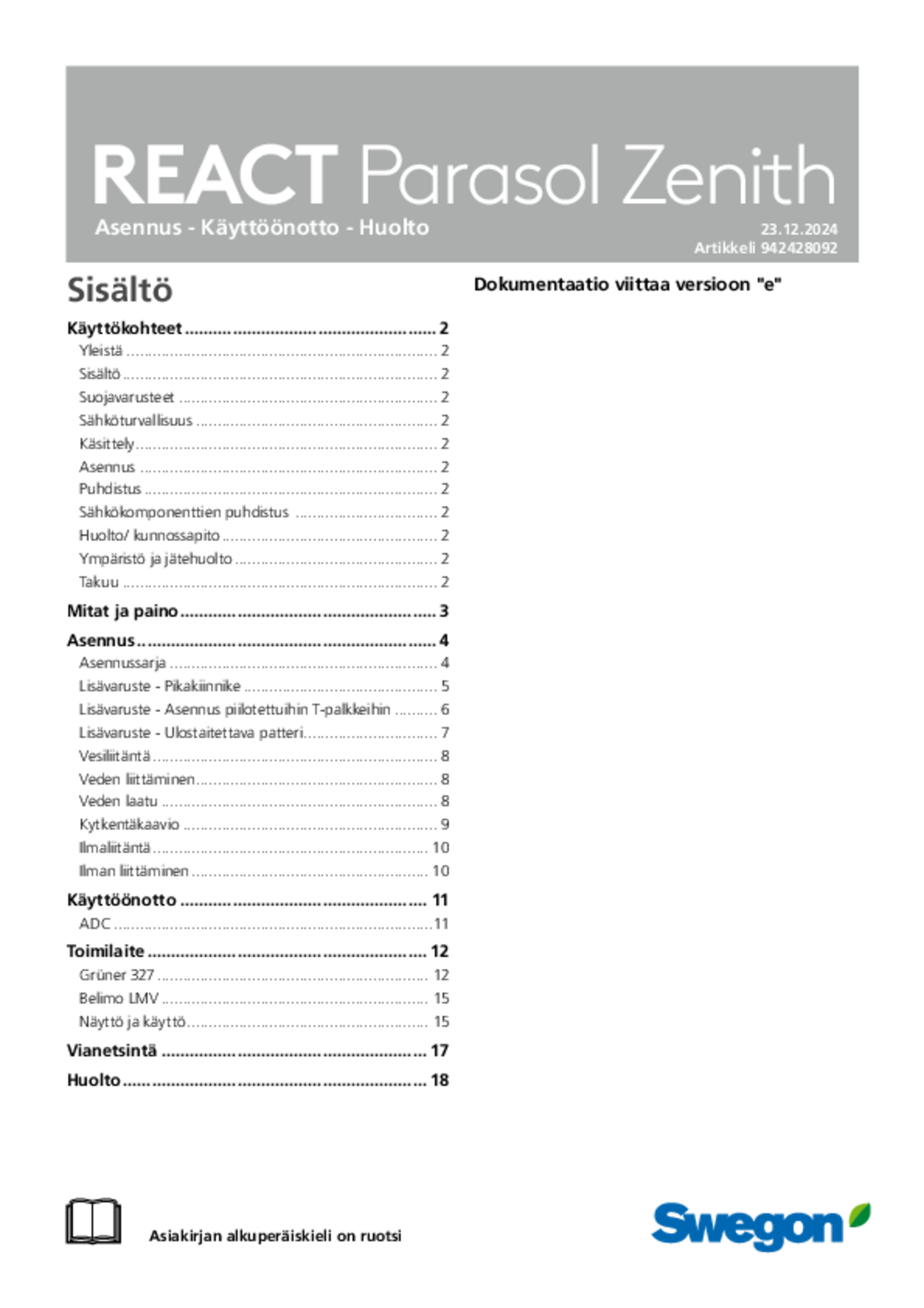 | Asennus, Käyttöönotto, Huolto (pdf 8.08MB) | REACT Parasol Zenith e | Asennus- ja huoltomanuaali | |