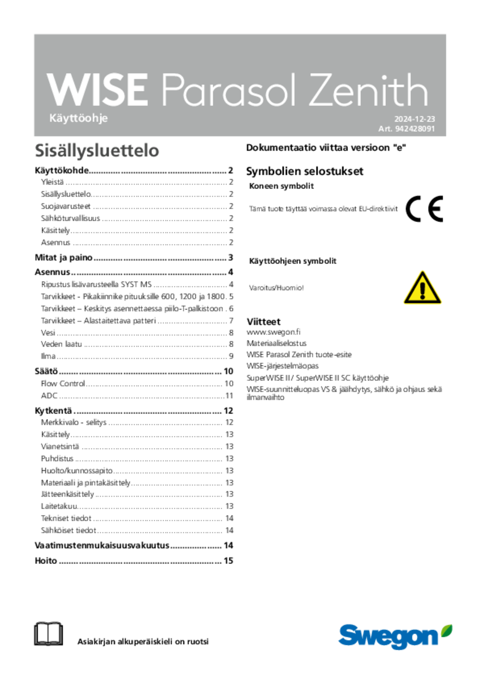 | Käyttöohje (pdf 8.77MB) | WISE Parasol Zenith e | Asennus- ja huoltomanuaali | |