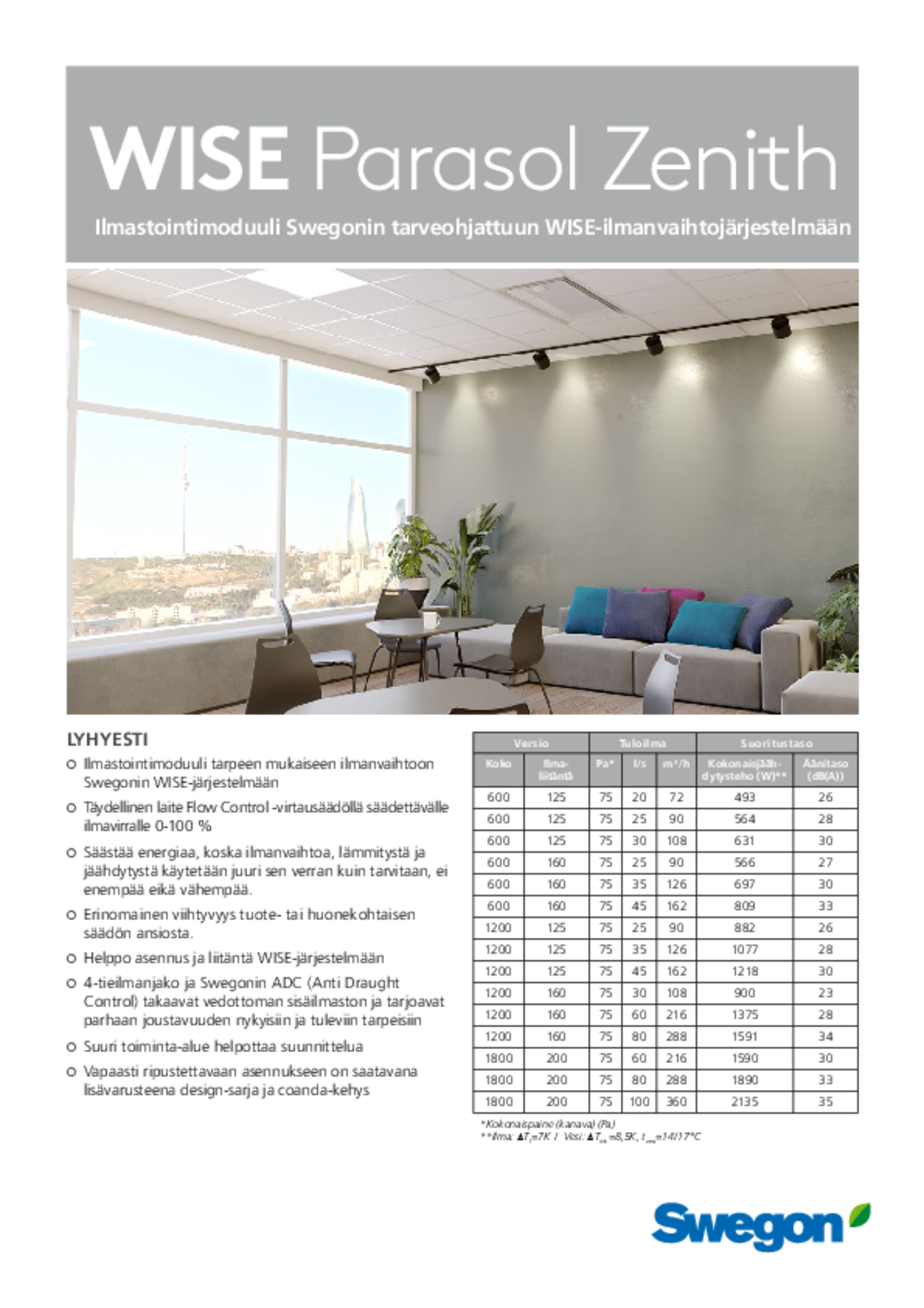 | Ilmastointimoduuli Swegonin tarveohjattuun WISE-ilmanvaihtojärjestelmään (pdf 7.05MB) | WISE Patasol Zenith e | Tekninen luettelo | |