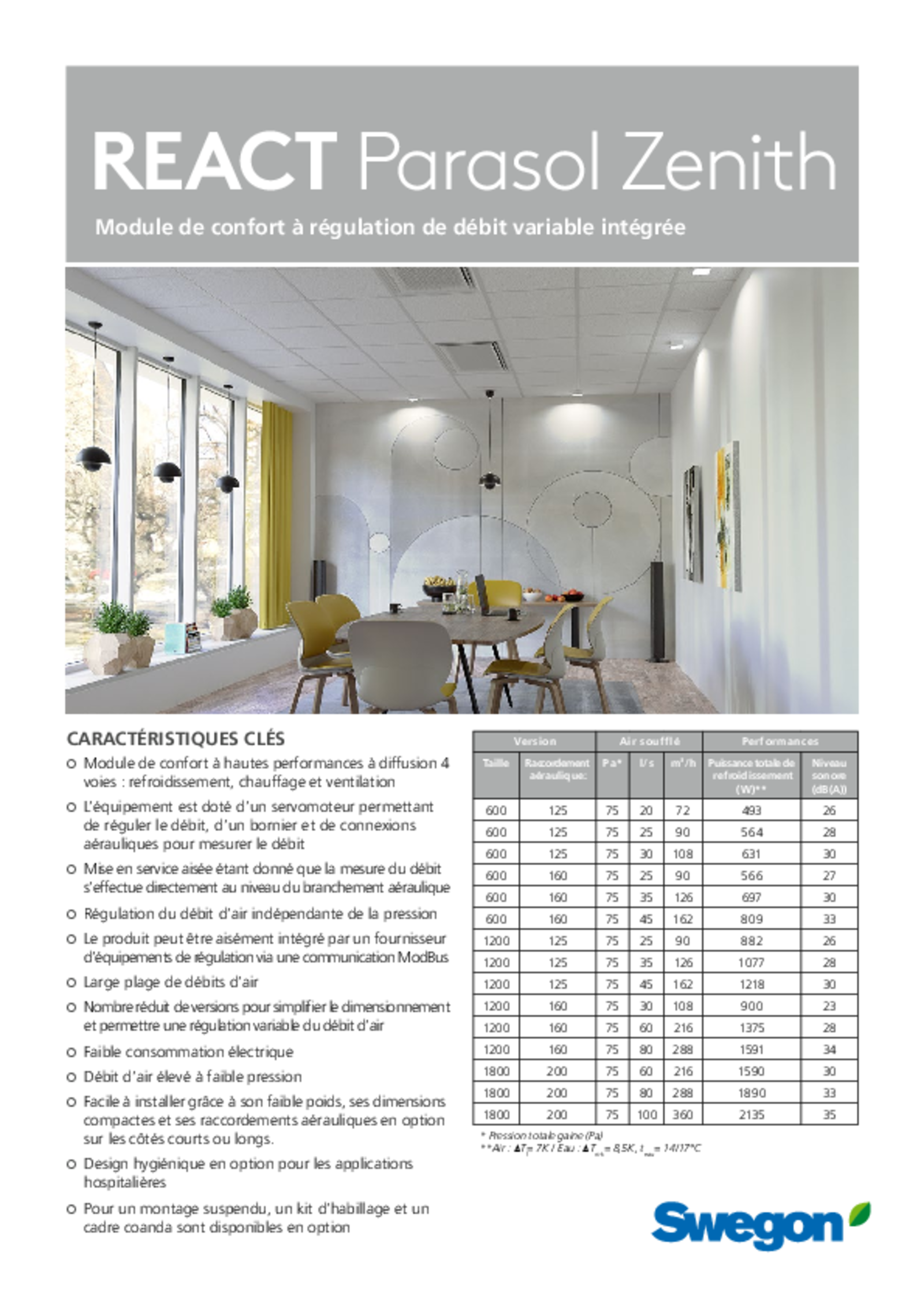 | Module de confort à régulation de débit variable intégrée (pdf 6.06MB) | REACT Parasol Zenith e | Brochure technique | |
