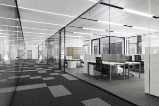De plus, l’acoustique de la pièce est bonne grâce à un voile acoustique spécialement développé qui est collé dans le panneau de plafond perforé. L’éclairage indirect via la surface réfléchissante du plafond permet d’obtenir un éclairage sans éblouissement de la pièce.