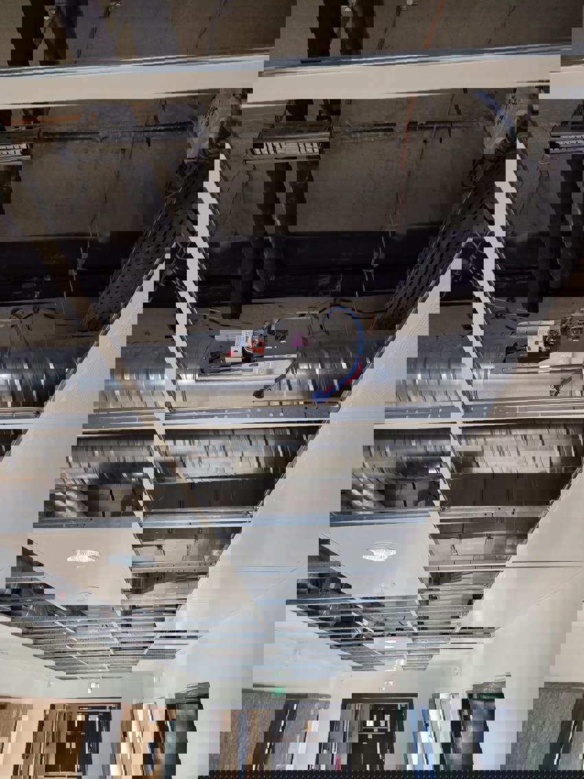Quatre centrales de traitement d'air GOLD (avec échangeur de chaleur rotatif) assurent un renouvellement d'air efficace, adaptant le débit aux besoins spécifiques de chaque espace. Mais c'est le système climatique WISE, associé aux panneaux rayonnants Barcol-Air, qui constitue le véritable cœur de cette installation. Ce système intelligent régule en temps réel la température, l'hygrométrie et la qualité de l'air, en tenant compte des paramètres extérieurs et des activités intérieures.