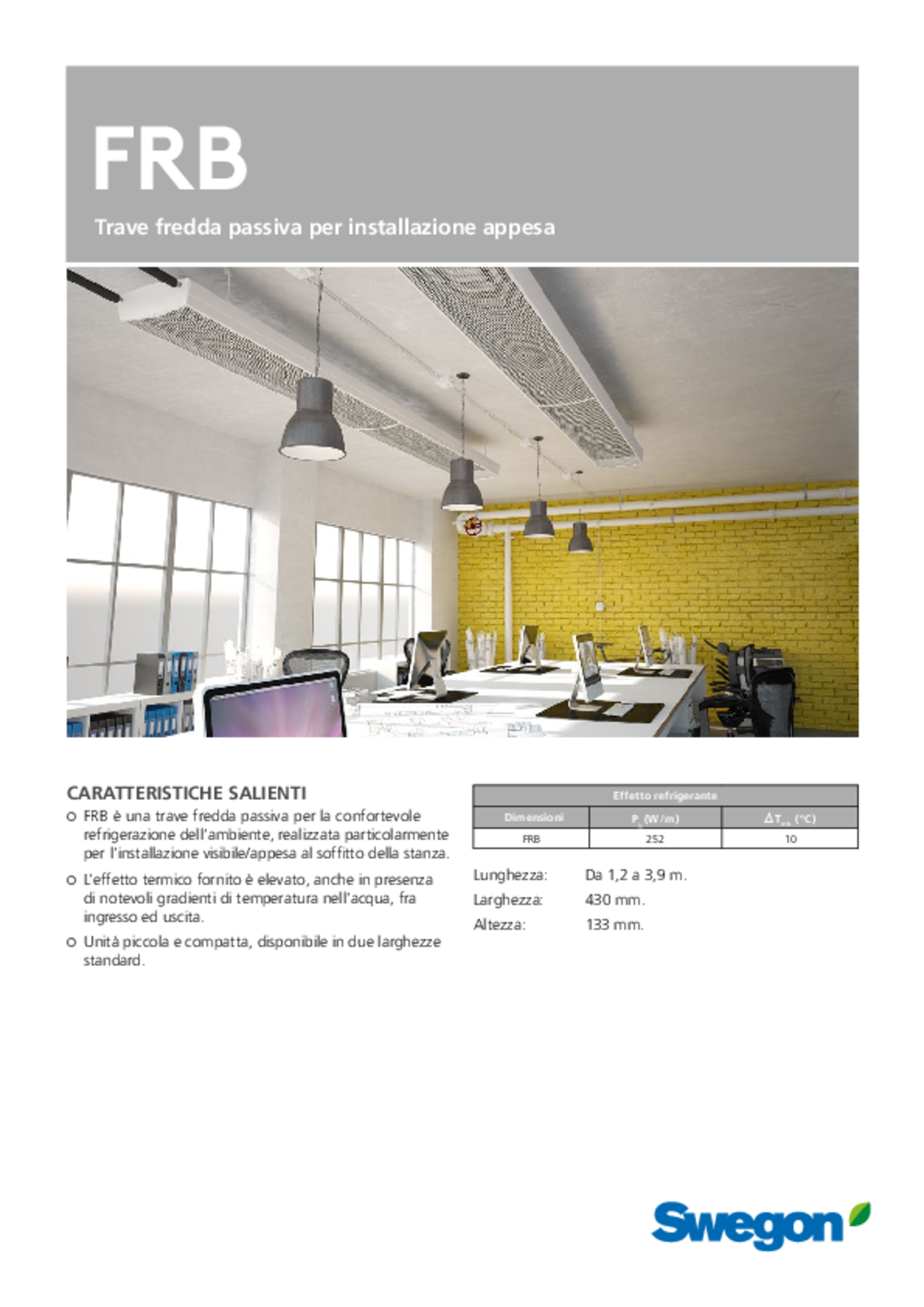 • FRB è una trave fredda passiva per raffreddamento comfort, appositamente progettata per l'installazione a vista/sospesa nell'ambiente.