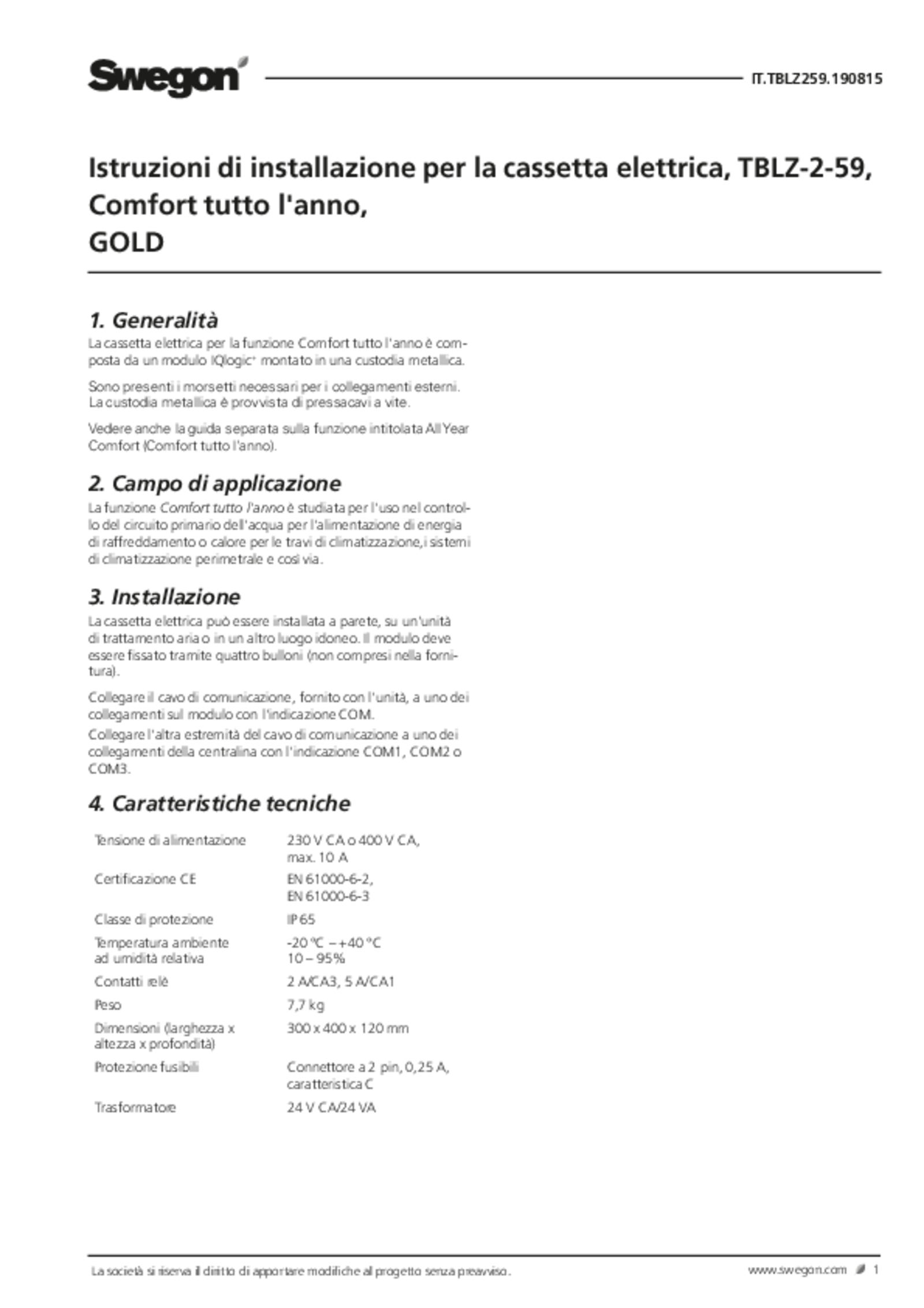 Cassetta elettrica, All Year Comfort (GOLD) (pdf 146.22kB) TBLZ-2-59 Manuale IOM