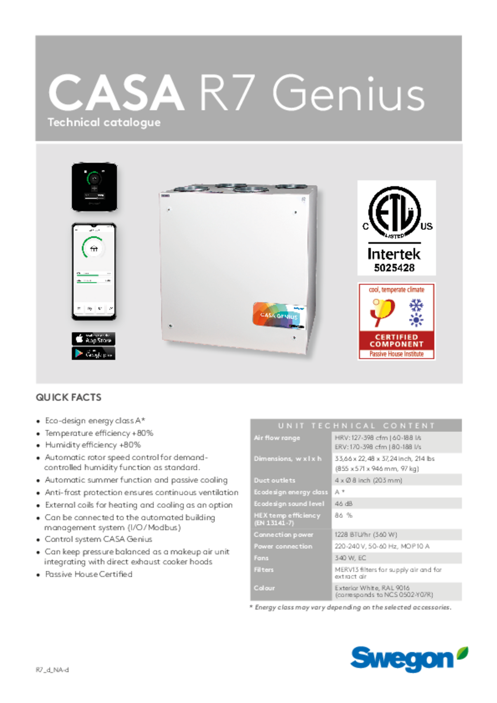 CASA R7 is a compact air handling unit with a rotary heat exchanger and controls, suitable for installation in the wall or ceiling and air flow rates of 127 - 398 CFM