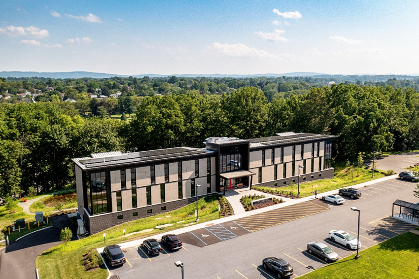 The Fahy Commons at Muhlenberg College in Allentown, Pennsylvania, is a sustainable facility featuring eco-friendly elements like a rain garden, native plantings, and views of Lake Muhlenberg. Living Builidng Challenge Core Certified & Phius Certified, it houses classrooms, offices, and creative spaces, offering a dynamic environment for learning and innovation. Powered by solar energy, with rainwater harvesting and energy-efficient systems, the building reflects the college’s commitment to sustainability and serves as a hub for community engagement.