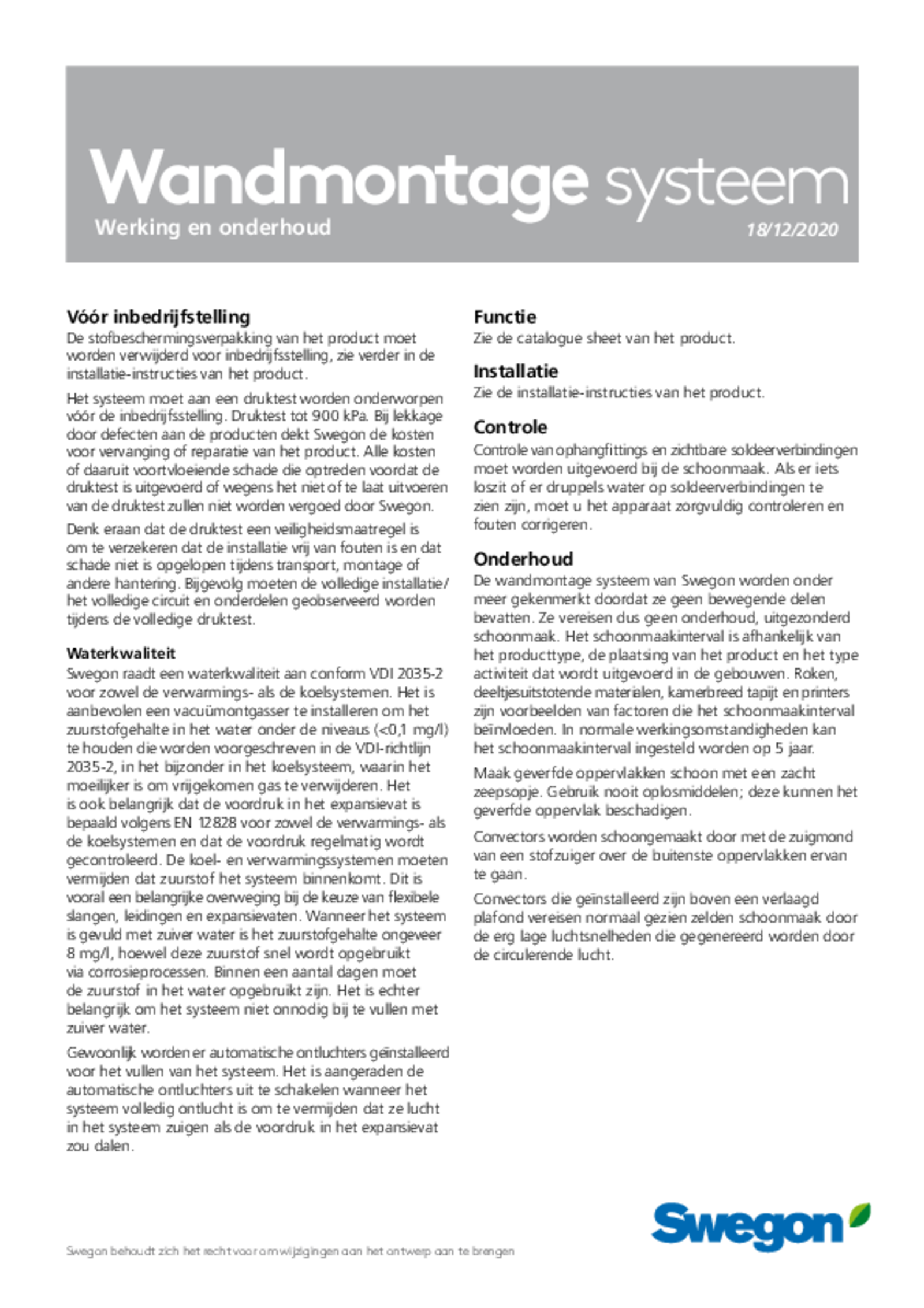 | Werking en onderhoud (pdf 40.6kB) | Wandmontage systeem | Installatie- en onderhoudsinstructies | |