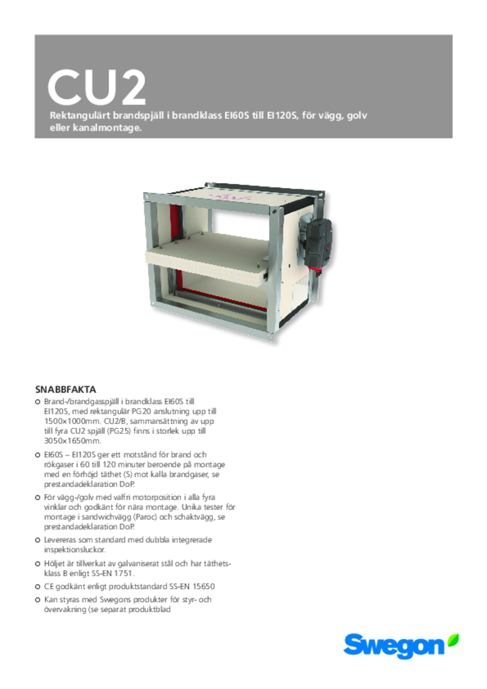 • CU2 er ett brann/branngasspjeld i brannklasse EI120S med rektangulær anslutning (PG20) fra 200x200 til 1500x1000