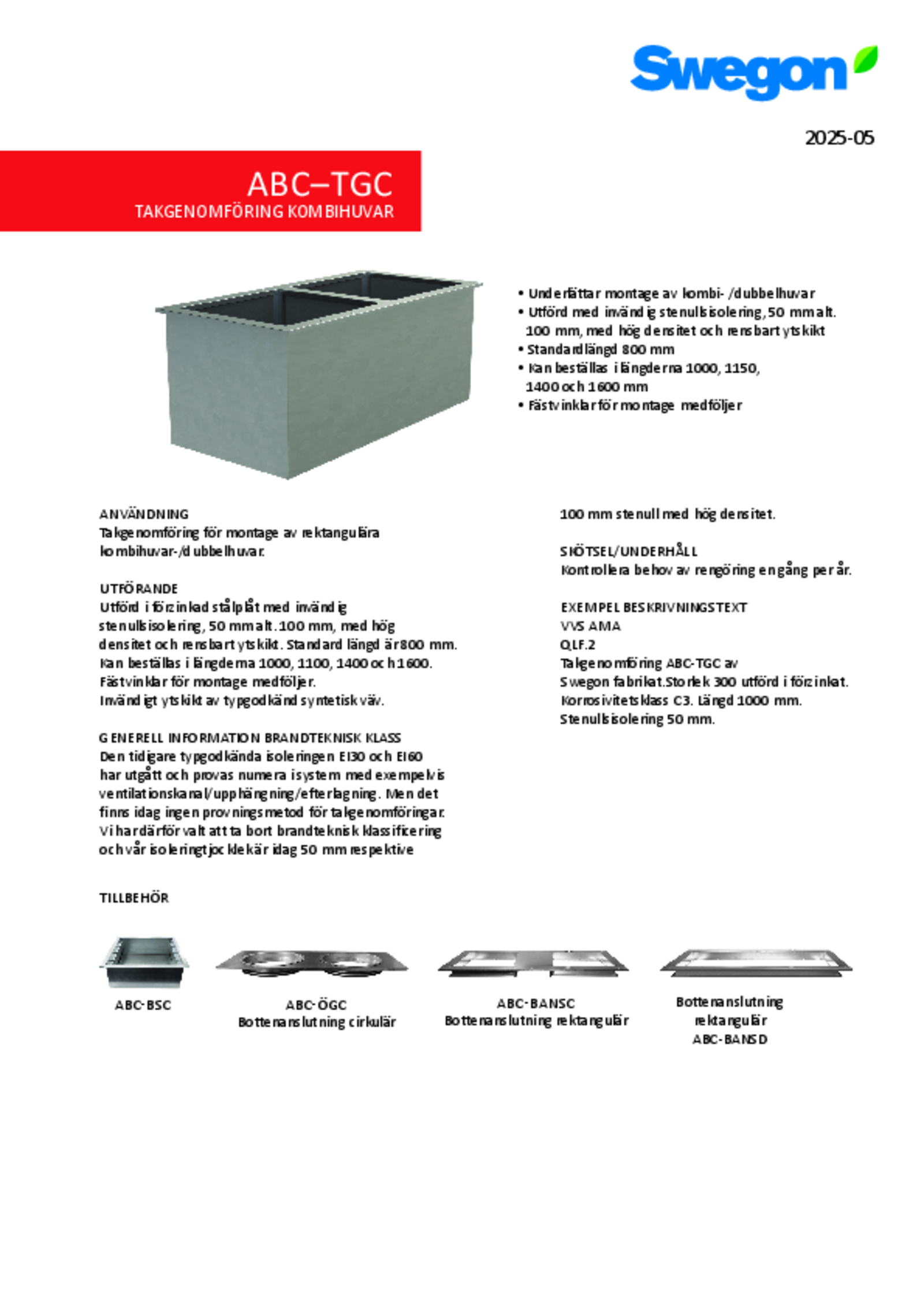 | Takgenomföring för montage av rektangulära kombihuvar-/dubbelhuvar (pdf 1.55MB) | ABC-TGC | Teknisk katalog |