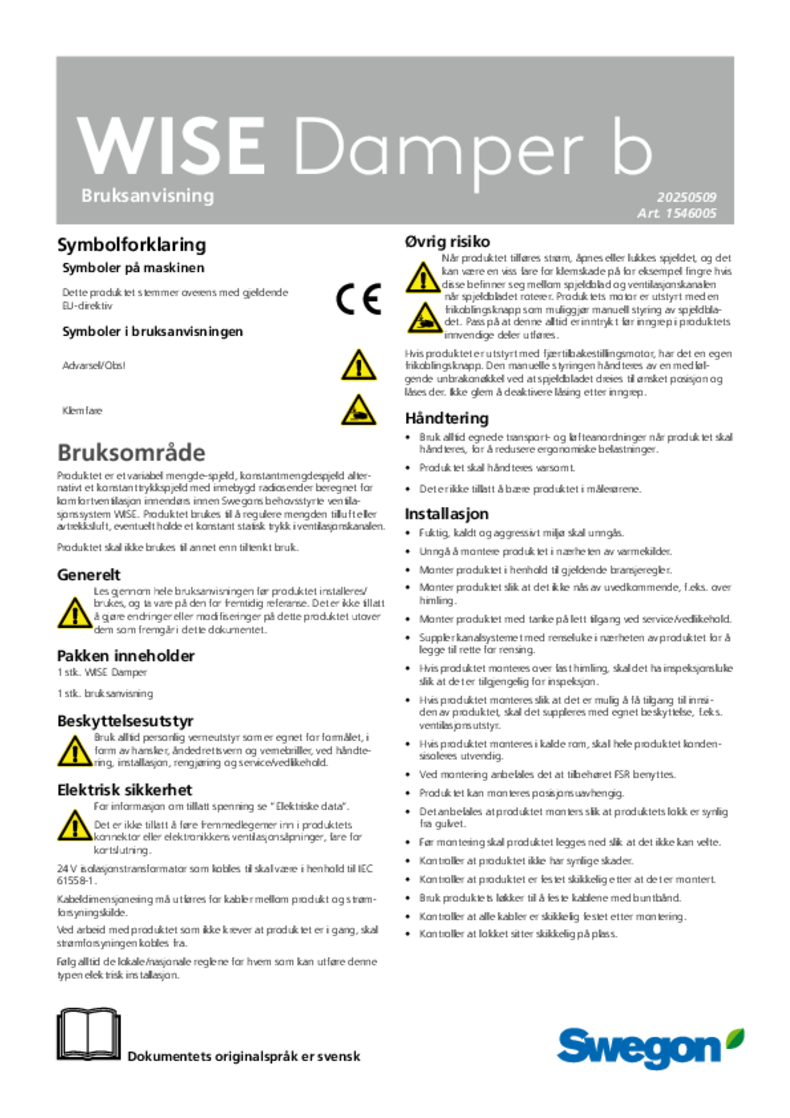 | Bruksanvisning (pdf 3.7MB) | WISE Damper b | FDV-manual | |