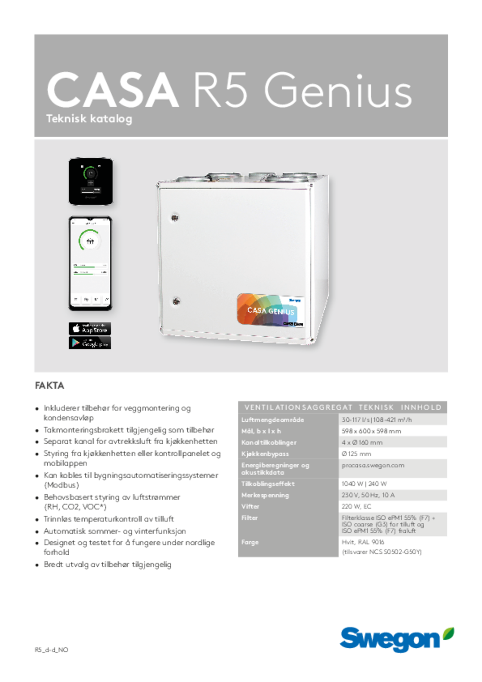 | CASA R5 Smart R RH | 108-421 | A | 4 x Ø 160 mm 1 x 125 mm | 230 V / 10 A | 600 | 598 | 597 | 78 | |