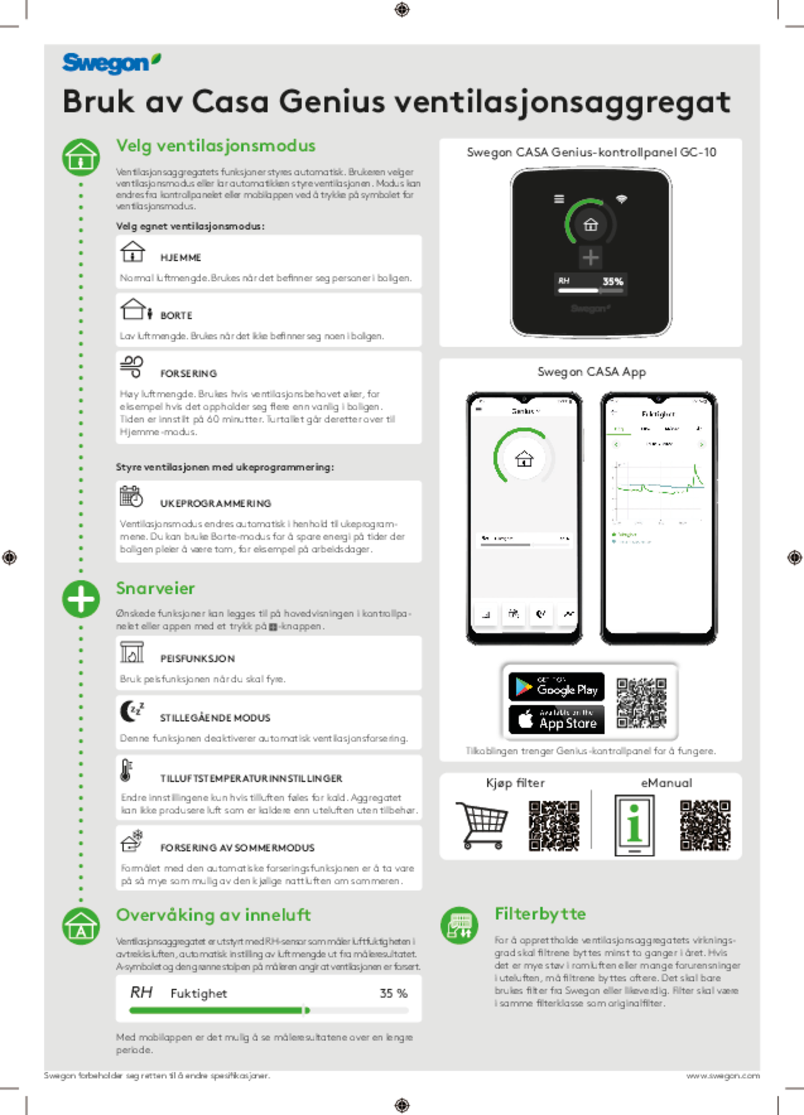 | Swegon CASA Genius Hurtiginnføring (pdf 1.39MB) | GENIUS | FDV-manual | |