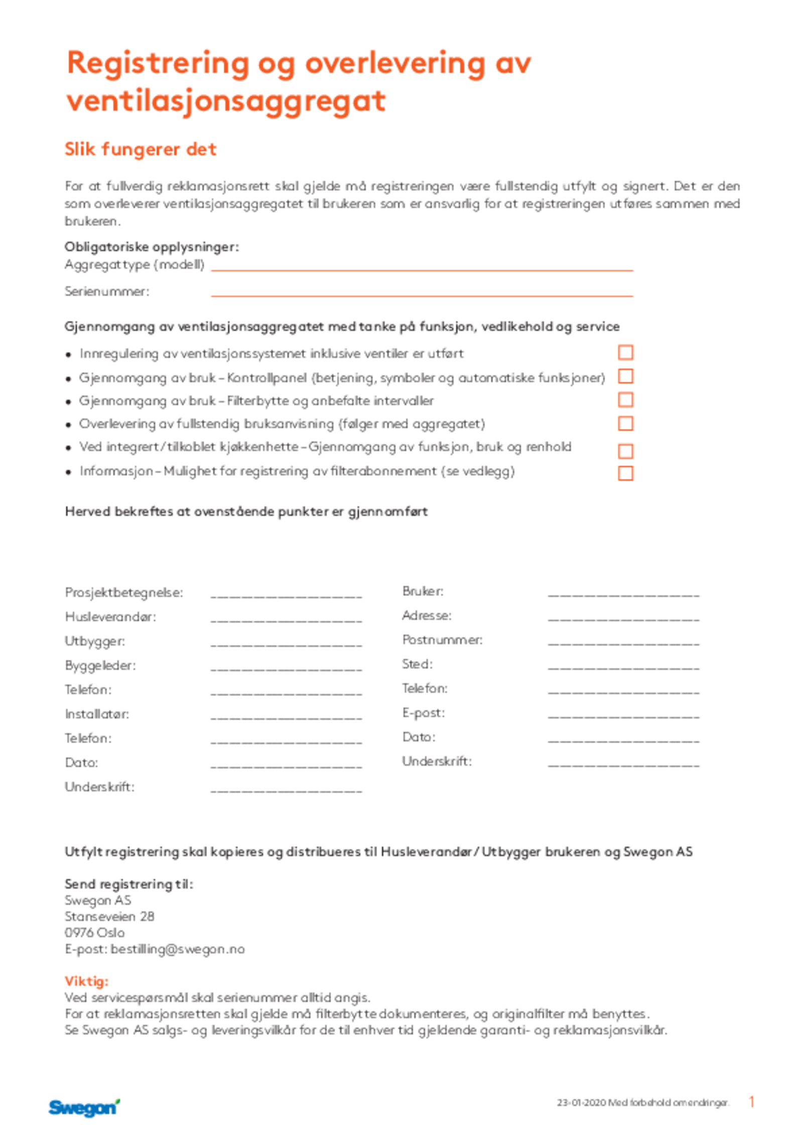 | Registrering og overlevering av ventilasjonsaggregat (pdf 523.59kB) | Swegon CASA | Brosjyre | |
