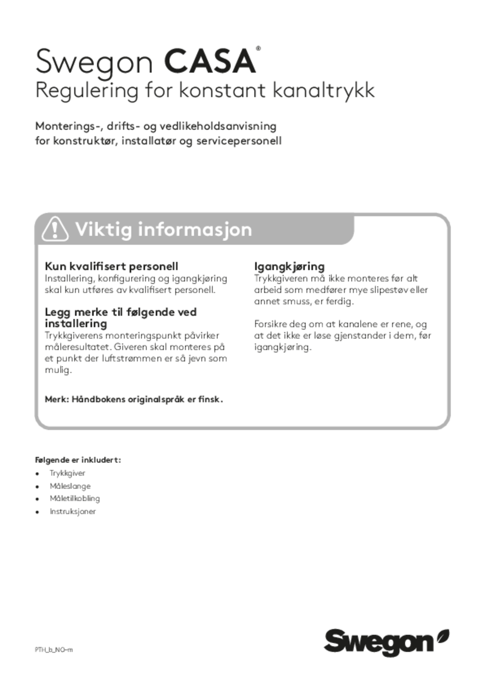 • Ved bruk av ventilasjonsaggregatets funksjon for konstant kanaltrykk reguleres viftehastighetene slik at trykket i kanalen konstant skal ligge pÃ¥ den innstilte verdien.
