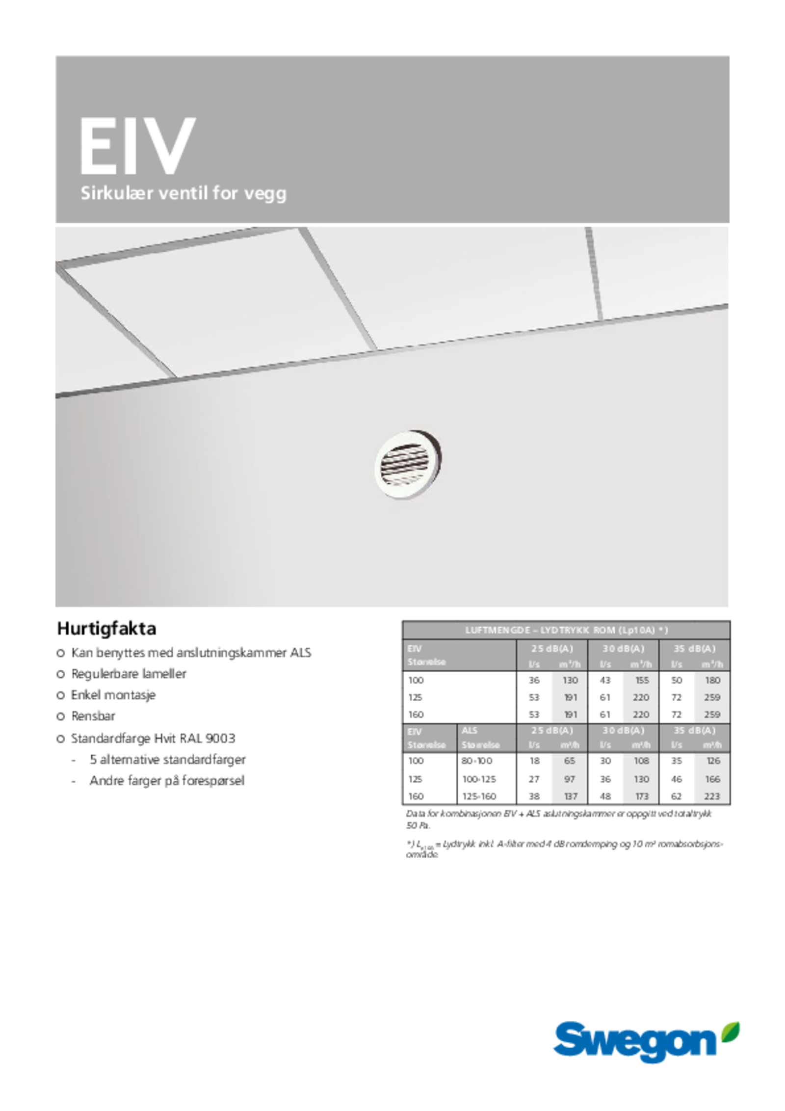 EIV er en sirkulær ventil med sirkulær tilkobling, beregnet på veggmontering. EIV har regulerbare lameller for innstilling av spredningsbilde og kastelengde. EIV kan dreies for horisontal eller vertikal justering av spredningsbilde. Vi anbefaler bruk sammen med det flerfunksjonelle plenumskammeret ALS for beste ytelse.